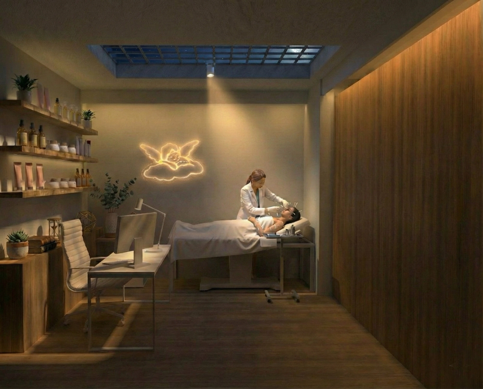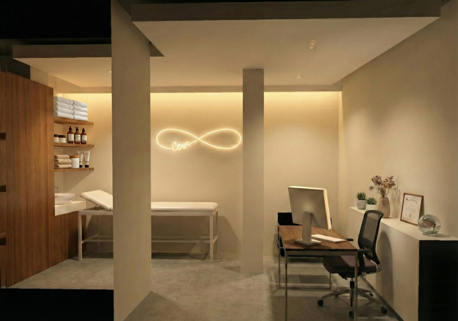 في صميم المقترح، تكشّف You Are The Light كإقرار حميمي. فقد صُمّمت كل غرفة علاج لاستضافة عنصر نيون خاص، ابتكره أستديو دادا Atelier dada على هيئة كتابة ضوئية ناعمة، مستوحاة من النموذج الباريسي التقليدي للافتات النيون، ومنقولة إلى الداخل ببريق مضبوط ومدروس. ومن خلال كلمات ورموز وإيحاءات نباتية دقيقة، عبّرت هذه الحضور الضوئية عن نية مشتركة: تذكير كل شخص بأن الضوء لا ينبعث من الفضاء وحده، بل من الداخل أيضًا.