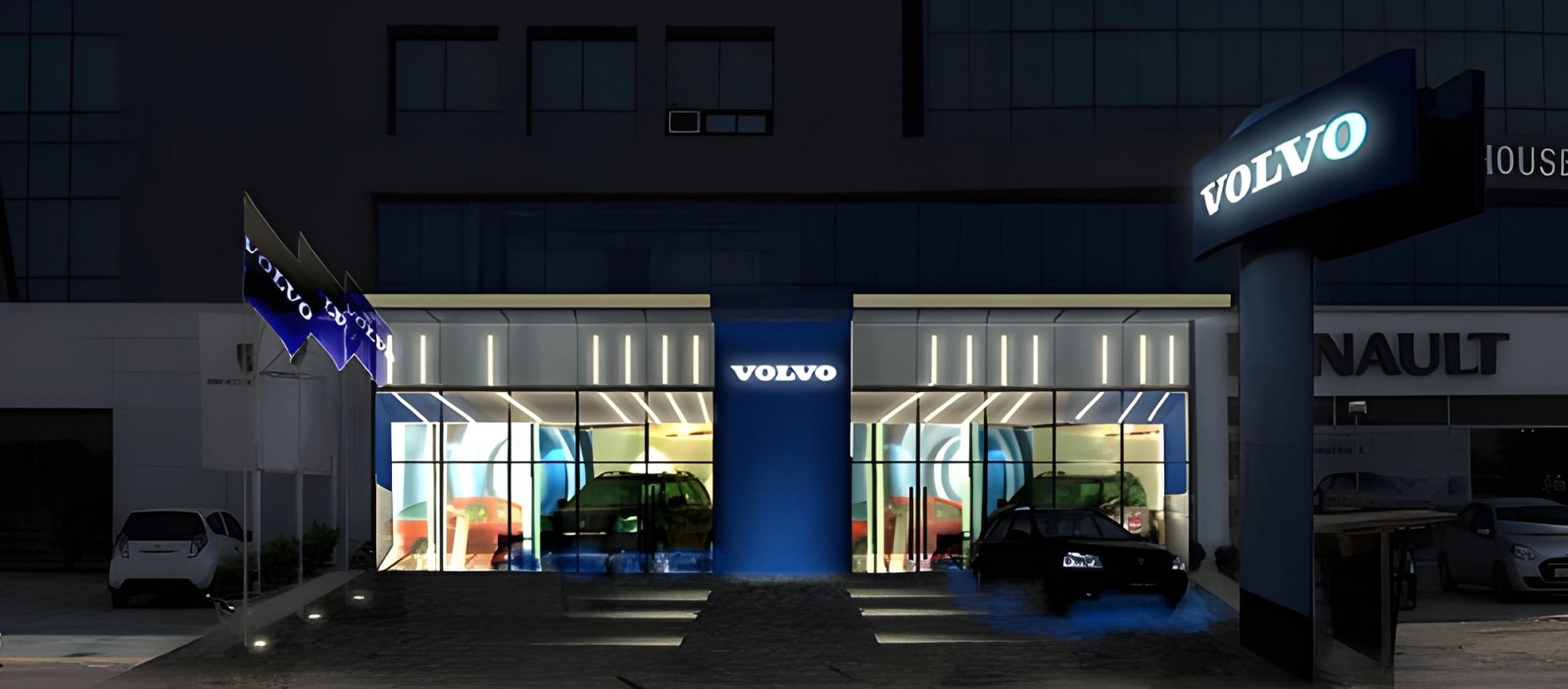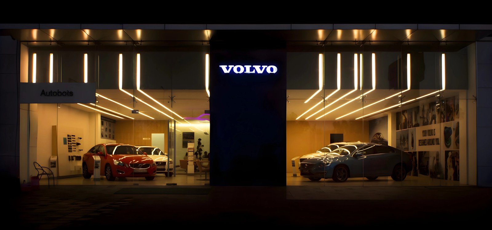 بالنسبة للواجهة الزجاجية بالكامل بمساحة 100 متر مربع لصالة عرض فولفو - والموضوعة بشكل استراتيجي بين صالتي عرض بورش ورينو والمصممة من قبل Blocher Blocher - طورت Atelier dada مفهوم إضاءة خطي بسيط مستوحى من وضوح وأناقة التصميم الاسكندنافي، وهو الأصل الثقافي لشركة فولفو. مثل أشعة الشمس التي تتخلل الزجاج، توجه خطوط الضوء الرقيقة النظرة إلى الداخل، وتجذب الانتباه بشكل طبيعي إلى المركبات والألواح المعروضة على طول الجدران المحيطة.