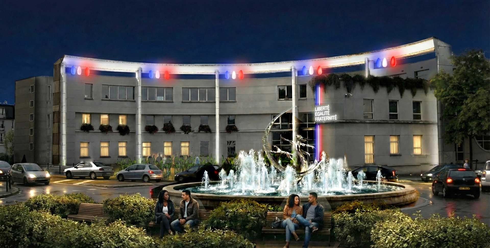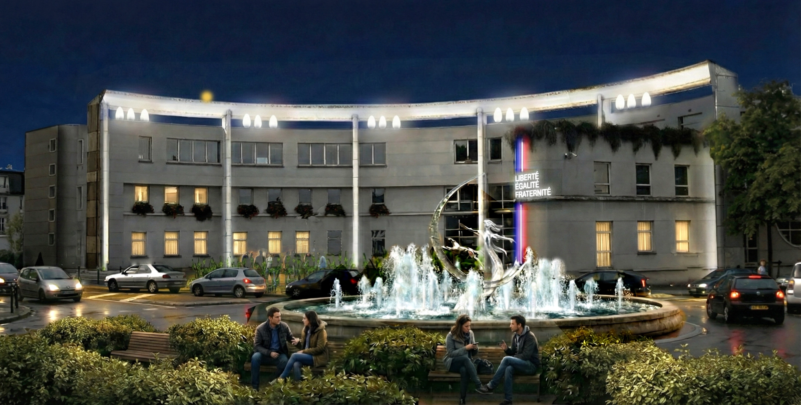 At the center of the roundabout, the existing fountain was replaced by a statue of Marianne, bow in hand, surrounded by illuminated water jets flowing continuously, day and night. Conceived as a symbol of renewal and prosperity, the fountain was designed to celebrate the civic spirit with dignity and presence.