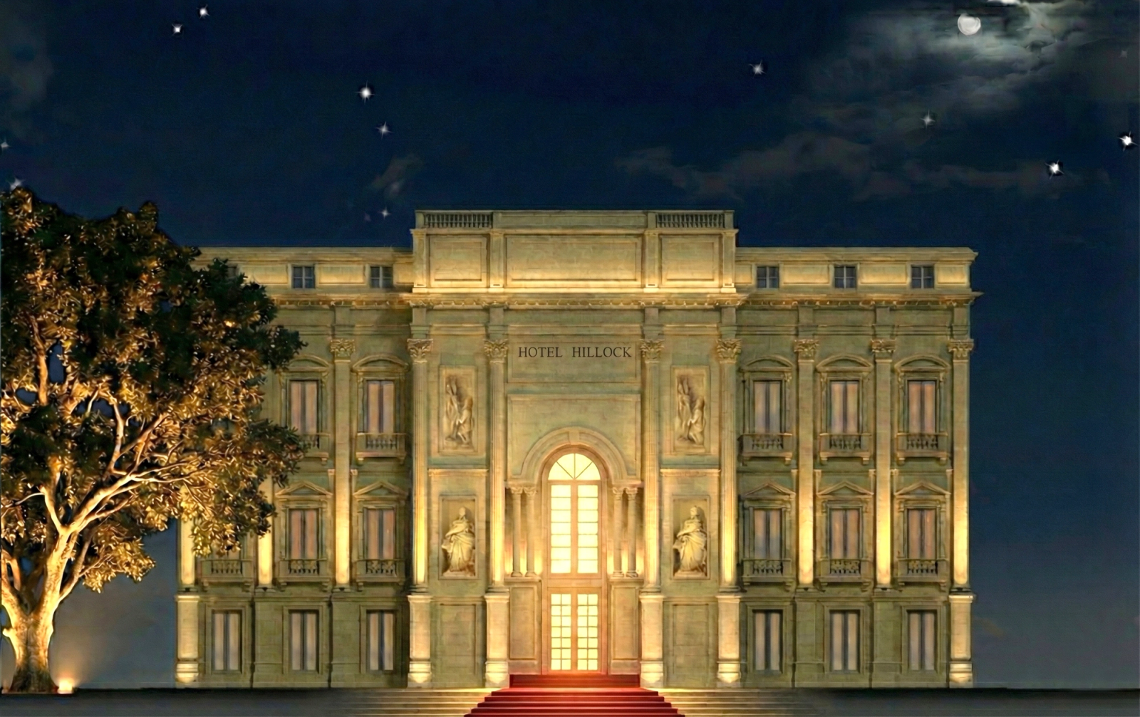 The façade lighting relies on warm uplighting to reveal columns, arches and cornices, creating a rhythmic composition that enhances the architectural hierarchy and reinforces the sense of timeless elegance. Along the side elevation, soft caustic projections and a balanced play of light and shadow animate the classical elements, giving depth and presence to the building after nightfall. At the entrance, accent lighting highlights the central arch and sculptural reliefs, inviting guests into a space where grandeur meets intimacy.