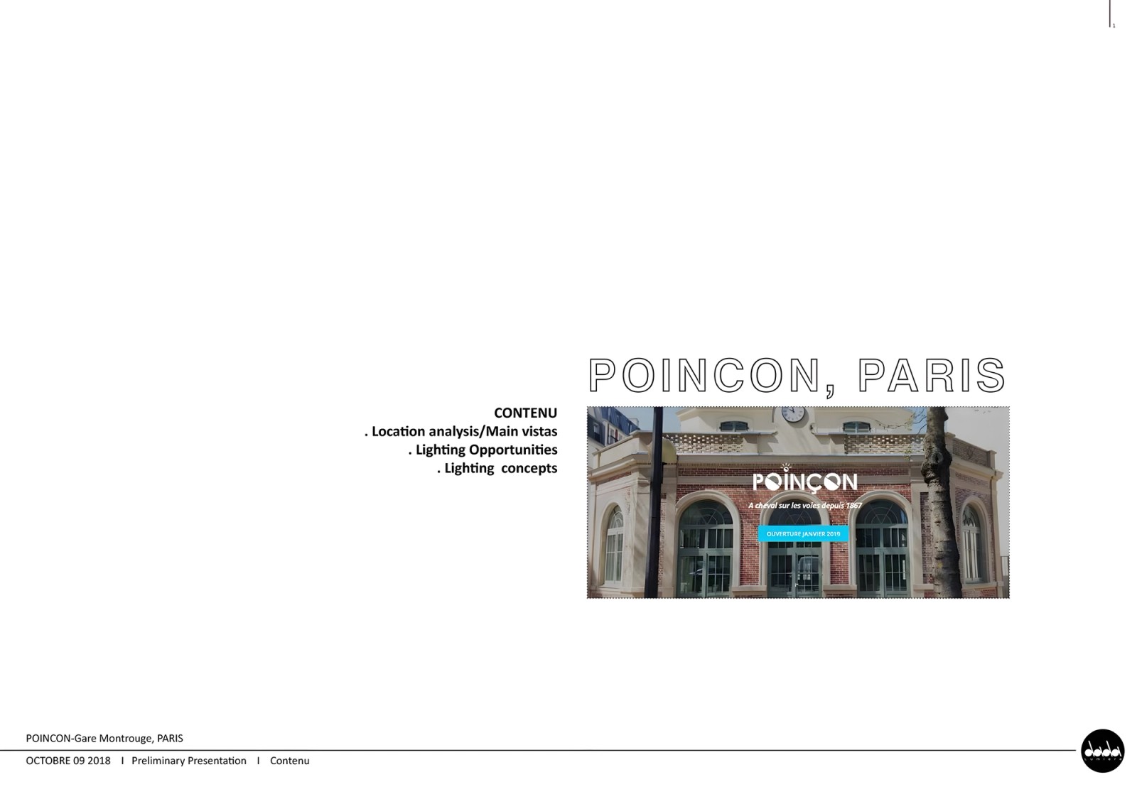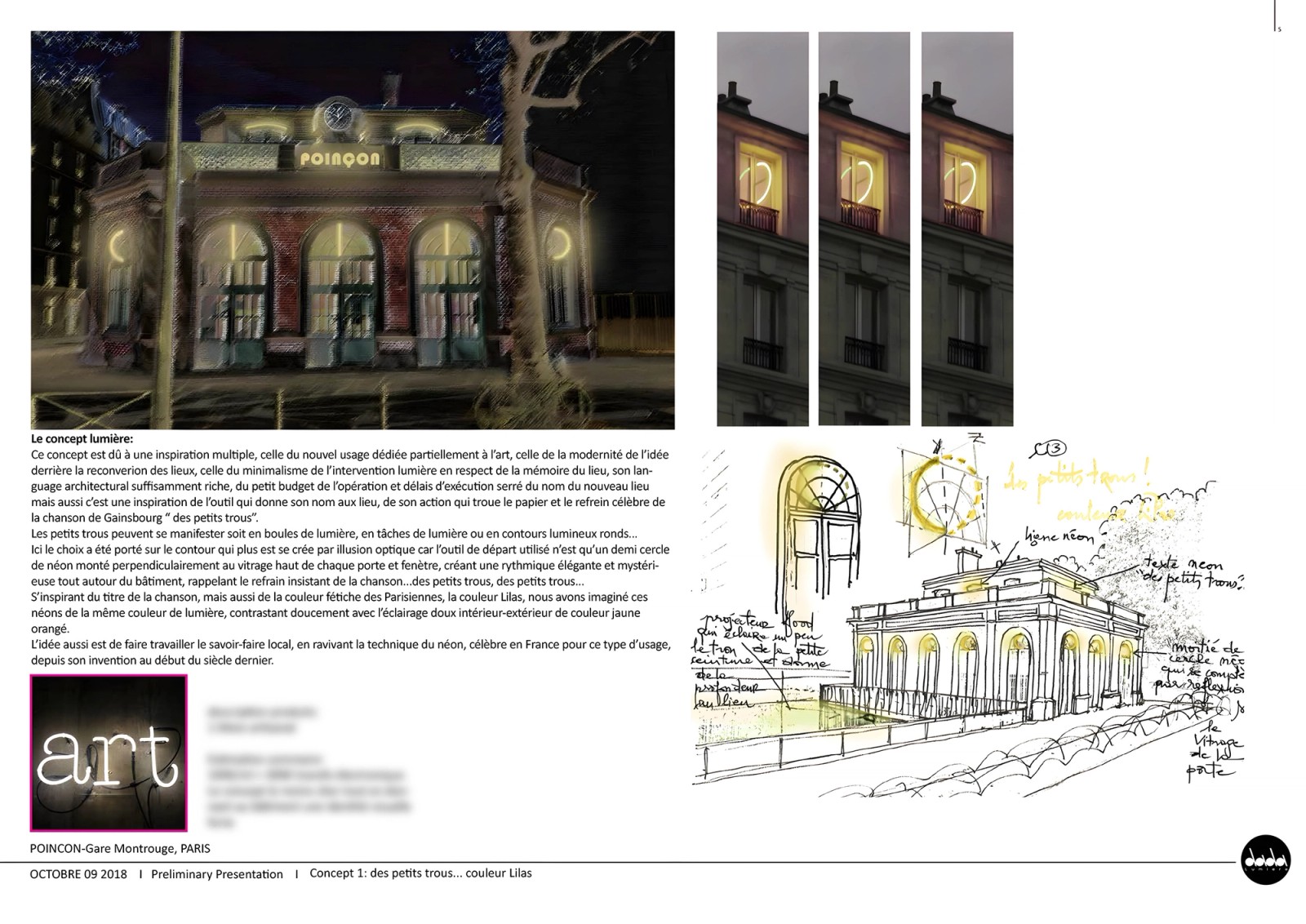 Several lighting concepts were explored, all rooted in a shared poetic and cultural matrix. The name Poinçon acts as a guiding thread, referring to the tool itself, the perforations it creates, the memory of punched tickets, and the musical reference to Serge Gainsbourg’s song. From this metaphor emerges a rhythmic language of “small holes of light,” expressed through luminous contours, punctuations, bands or projections, always in dialogue with the architecture.