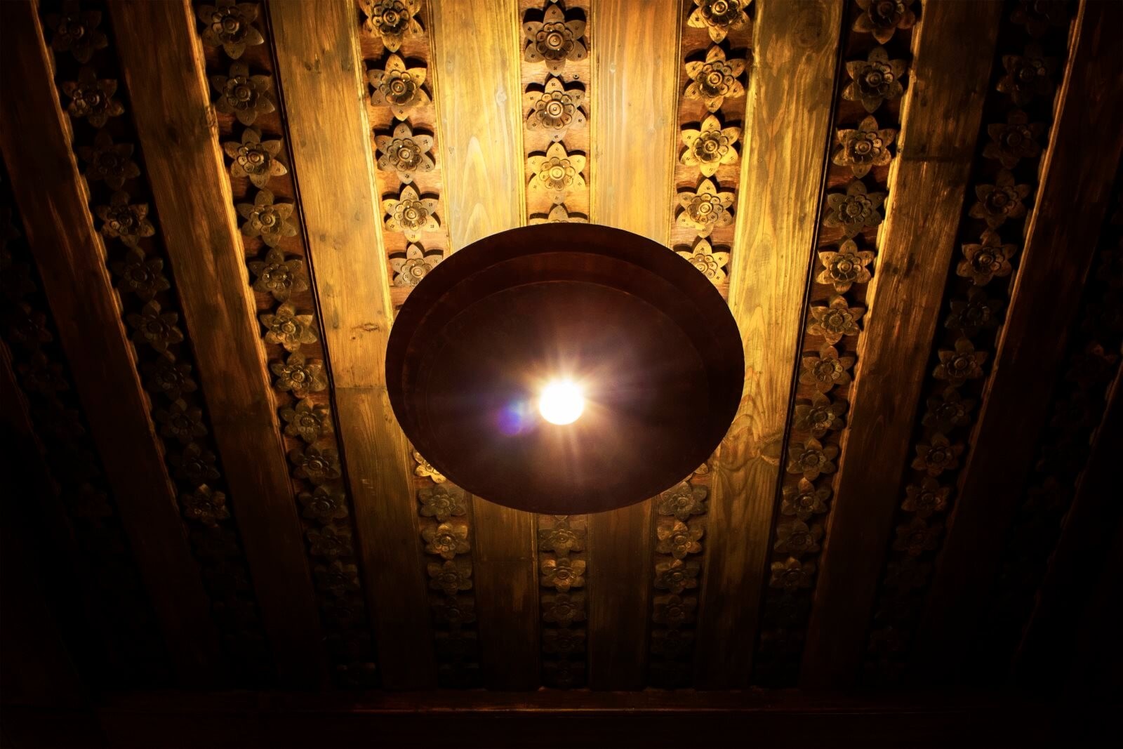 Des luminaires dessinés sur mesure jouent un rôle central dans cette mise en scène lumineuse. Ils viennent délicatement éclairer chaque table, tout en révélant la richesse du plafond en bois sculpté et en offrant un confort visuel précis aux convives. Des sources dissimulées ont également été intégrées pour souligner subtilement les alcôves et niches sculpturales, créant des points focaux en résonance avec la collection d’objets anciens.