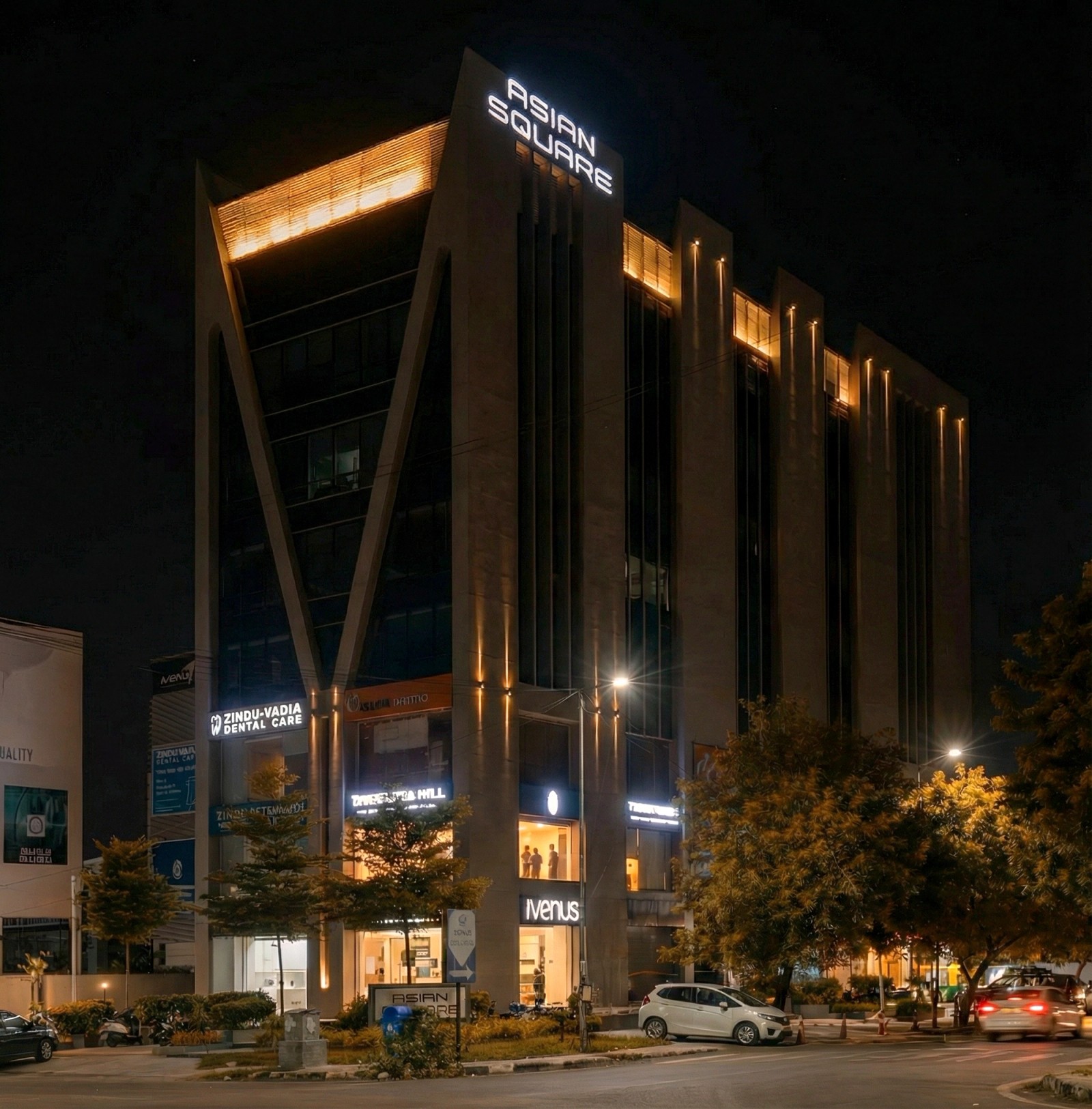 En réponse, Atelier dada a conçu Distinctive Silhouette, une écriture lumineuse qui met en valeur les lignes architecturales et la forme globale du bâtiment. En s’appuyant sur un éclairage statique — dans l’esprit de notre intervention sur Shivalik High Street — le projet révèle des éléments clés de la façade avec précision, permettant à la tour de se distinguer par la clarté de sa silhouette plutôt que par l’effet.