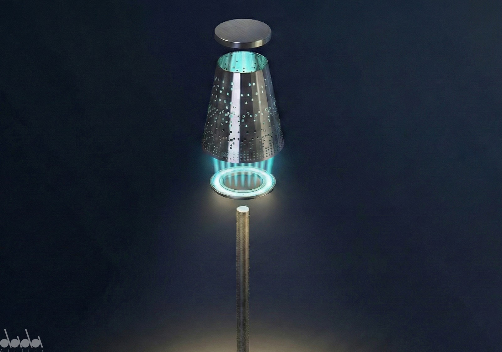 Son abat-jour en aluminium poly-miroir ajouré, dessiné selon une gradation fine de pixels, entre en résonance avec l’enveloppe architecturale de la sous-station voisine, conçue par Richez et Associés et mise en lumière par Atelier dada. L’objet ne s’impose pas : il prolonge, il accompagne, il répond.