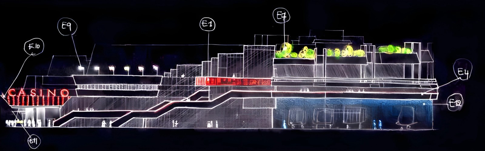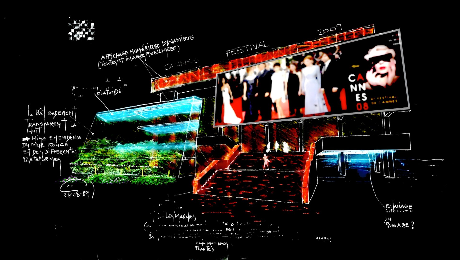 En étroite collaboration avec les équipes de Wilmotte & Associés et de MC2, Atelier dada a conçu un univers lumineux poétique, capable d’envelopper le Cannes Palace d’une aura subtile et presque cinématographique, attirant aussi bien le regard des habitants que celui des visiteurs internationaux. Ce projet a remporté le premier prix du concours, saluant la justesse et la sensibilité de la vision proposée. Malgré cette reconnaissance, le concept n’a pas été réalisé, en raison de contraintes budgétaires.