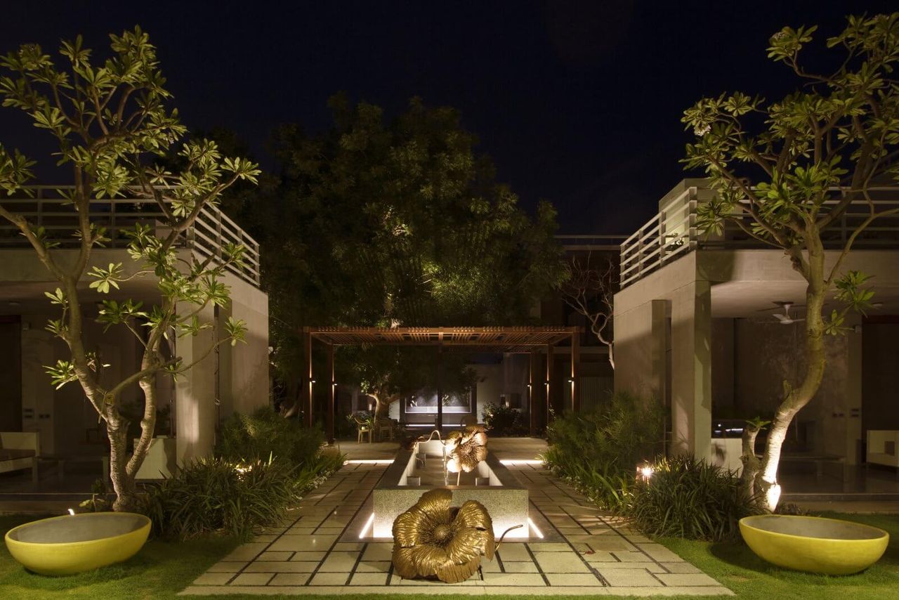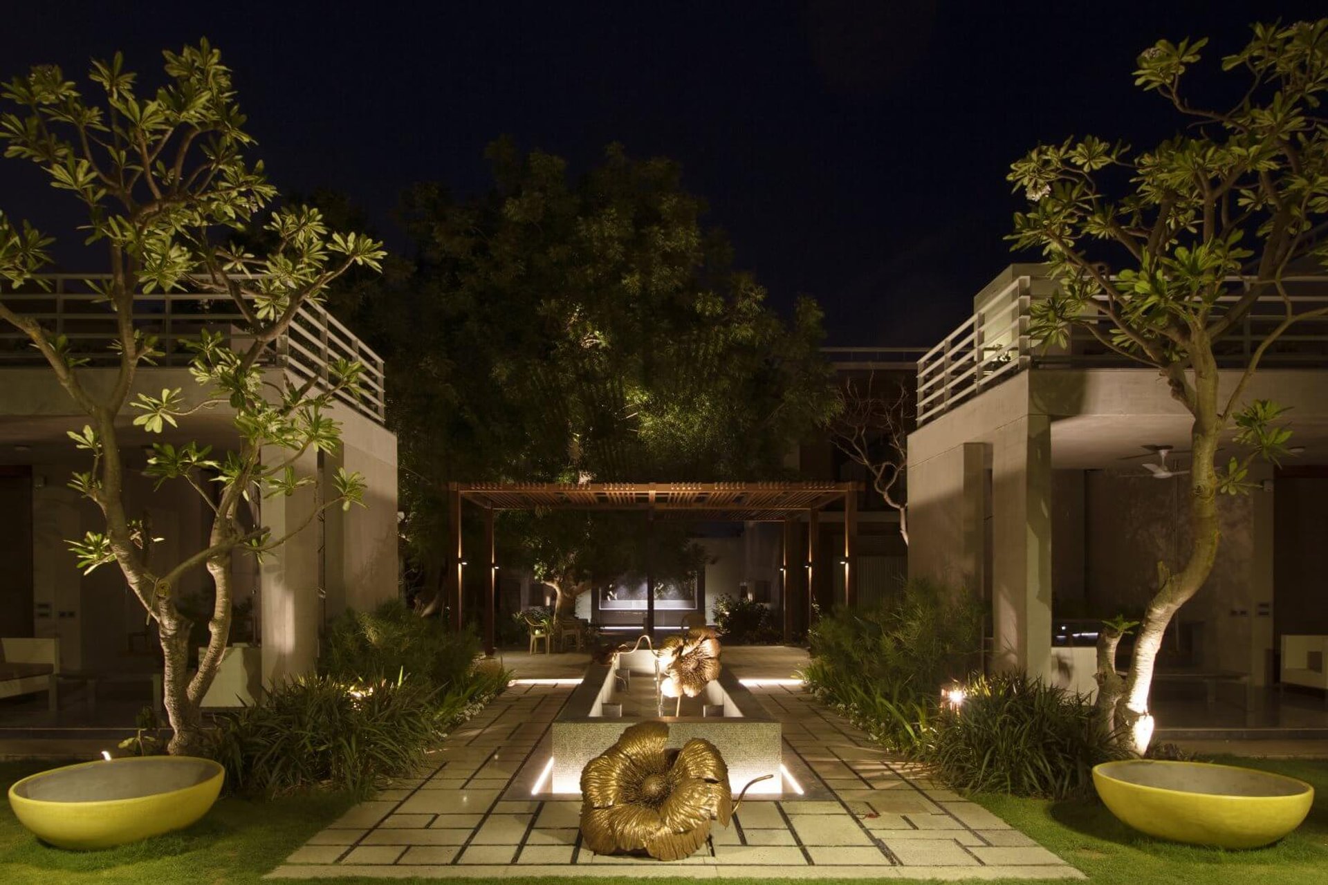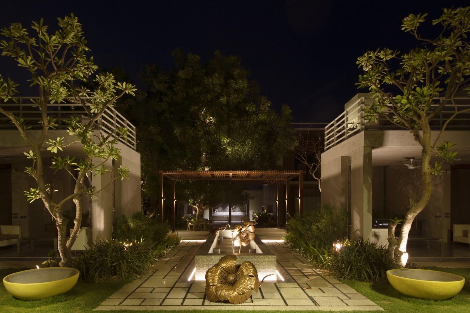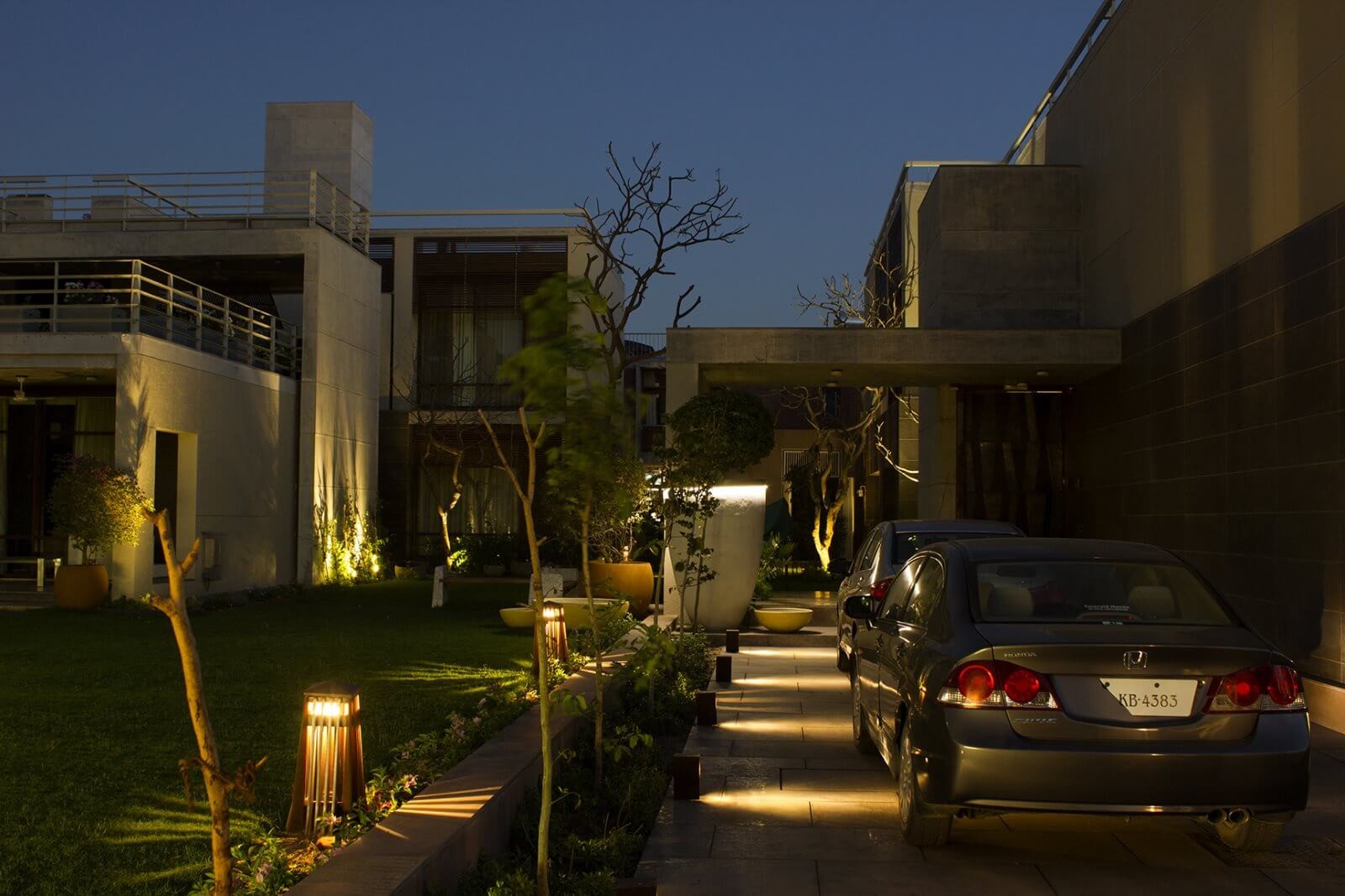 Atelier dada a été chargé de concevoir la mise en lumière paysagère du jardin commun entre les deux villas jumelles du client Dalal, situées dans un quartier résidentiel de luxe. Dans le respect des valeurs de frugalité et de durabilité, nous avons opté pour un éclairage minimaliste et discret, alliant confort visuel et sobriété. En utilisant du mobilier d’éclairage standard habilement dissimulé dans la végétation, chaque élément du jardin est délicatement mis en valeur, des arbres aux fonds de perspective, sans jamais surcharger l’espace. Notre approche paysagère vise à créer un espace extérieur intime et chaleureux, où chaque source lumineuse se fond dans le décor pour sublimer la nature environnante. Grâce à une collaboration avec des artisans locaux, ce projet met l’accent sur des matériaux à faible impact environnemental et des procédés de fabrication respectueux de l’environnement.