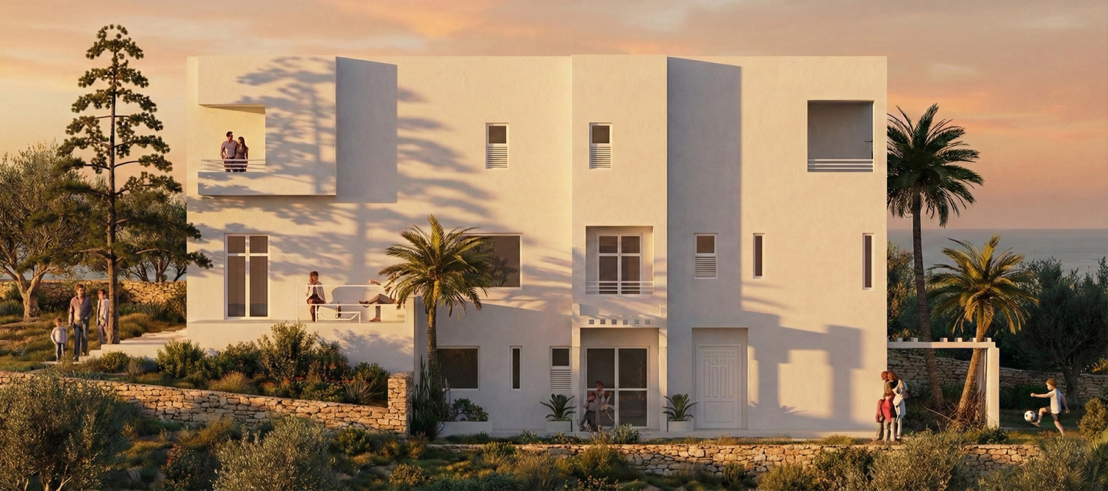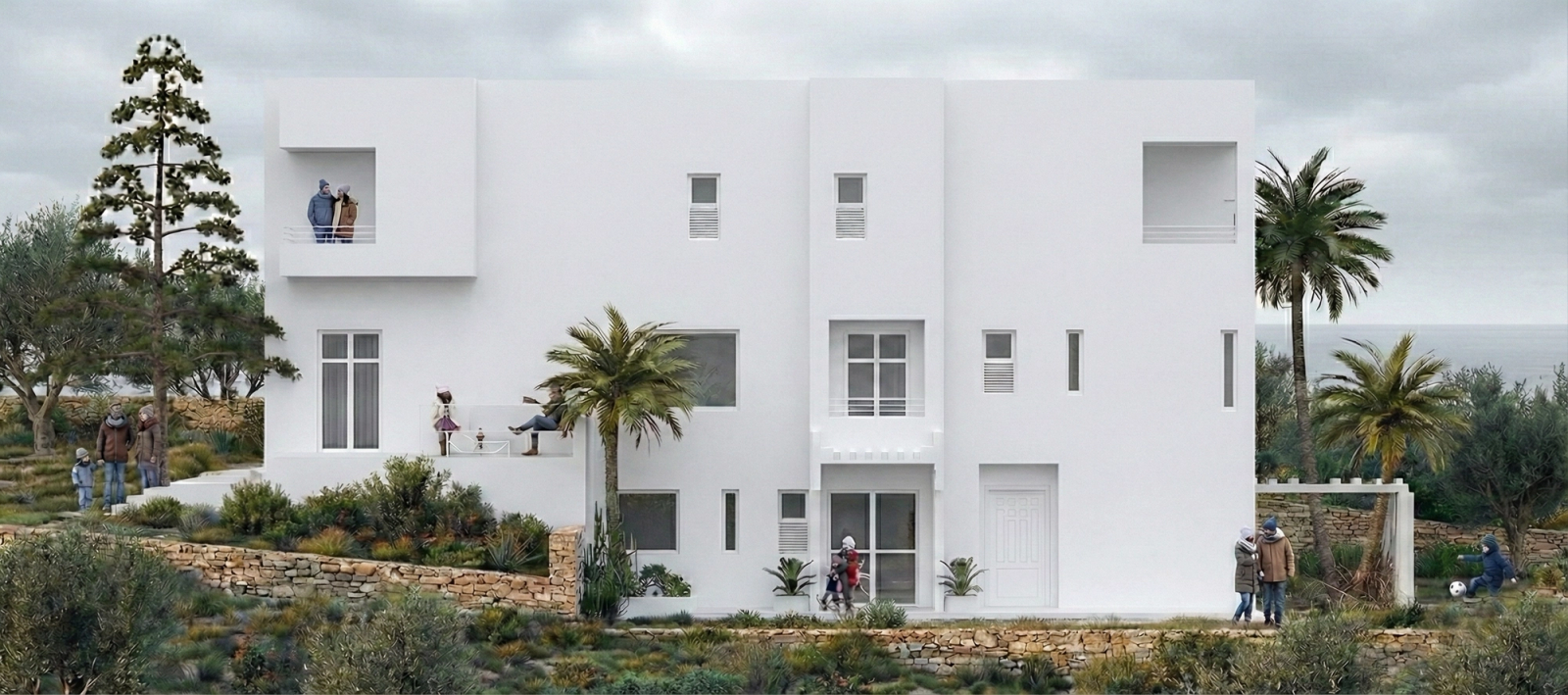 Conçu entre 2001 et 2005 en collaboration avec l’architecte Rached Chaabani, le projet répondait à un programme résidentiel exigeant, sur une parcelle réduite et à forte valeur foncière. Plutôt que de nier la pente, l’architecture a choisi de composer avec elle, en épousant le relief naturel du terrain.