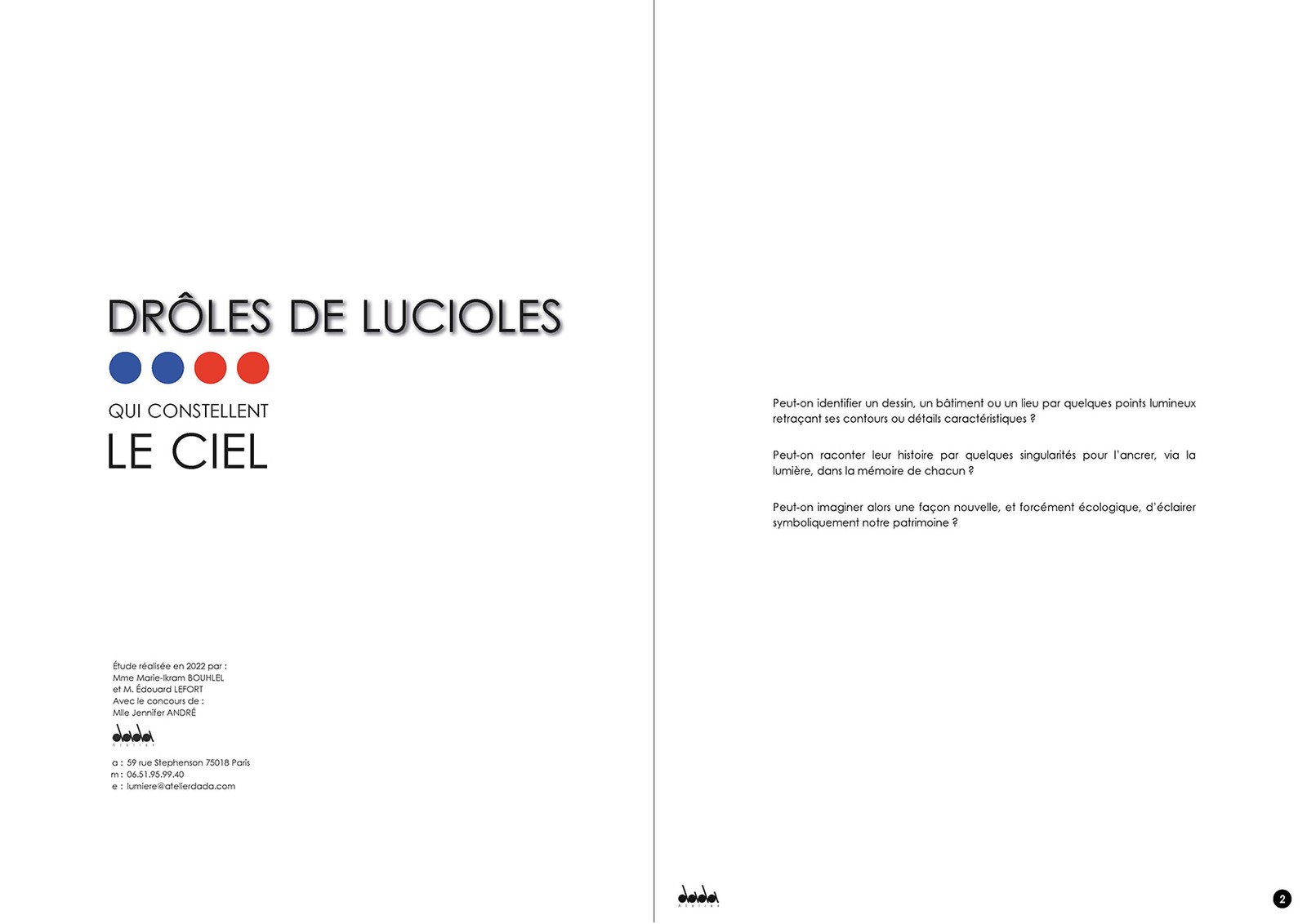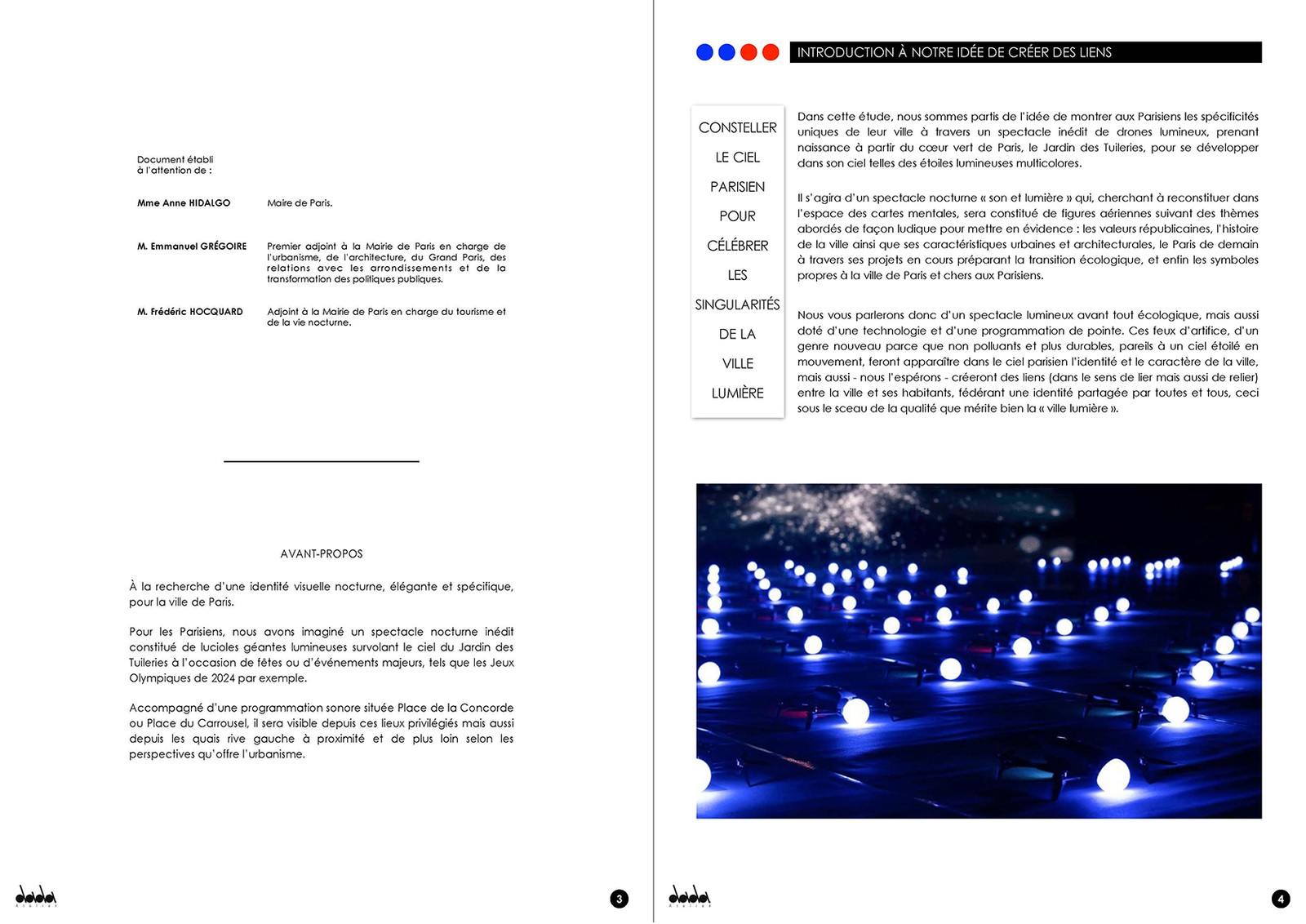 Dans cette étude, Atelier dada a imaginé un spectacle inédit de drones lumineux, invitant les Parisiens à redécouvrir l’âme de leur ville. Depuis le coeur vert de Paris, tel le Jardin des Tuileries, ce ballet de lumières s’élèverait comme une constellation colorée dans le ciel nocturne. Ce spectacle son et lumière recompose, de manière ludique et immersive, les cartes mentales de Paris. À travers des figures aériennes, il mettrait en scène les valeurs républicaines, l’histoire, l’architecture, le Paris de demain engagé dans la transition écologique, et les symboles chers aux Parisiens. Porté par une technologie de pointe, ce feu d’artifice d’un nouveau genre est pensé pour être écologique et durable, un ciel étoilé mouvant qui révèle l’identité de la ville tout en créant des liens profonds entre Paris et ses habitants, fédérant une identité commune digne de la Ville Lumière.