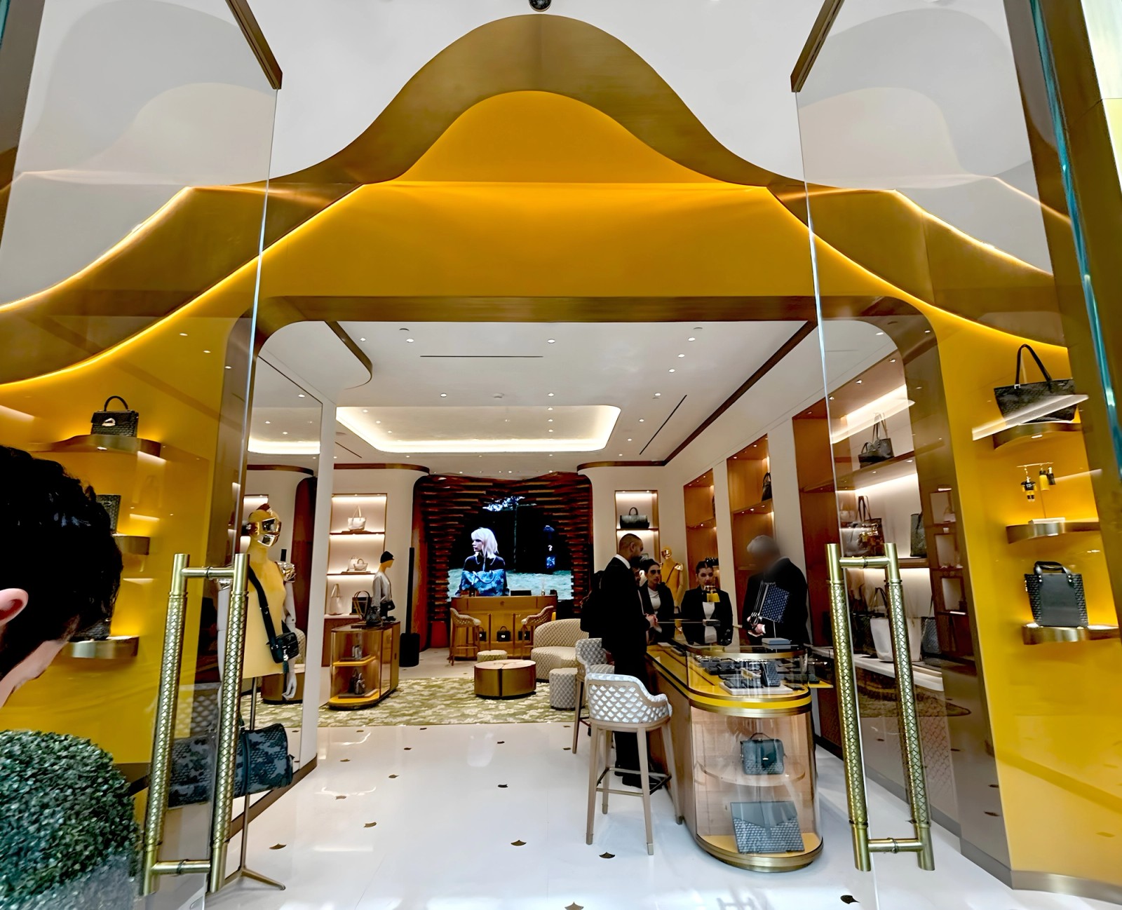 À l'intérieur, la boutique prolonge ce voyage immersif dans un univers où tradition et modernité s'entrelacent harmonieusement. S'inspirant de tentes luxueuses, les courbes architecturales enveloppent l'espace, créant une atmosphère chaleureuse et intime. Chaque élément – des étagères à mi-échelle au comptoir de caisse encadré par deux palmiers stylisés formant un arc protecteur – célèbre cette rencontre entre les influences parisiennes et du Moyen-Orient.