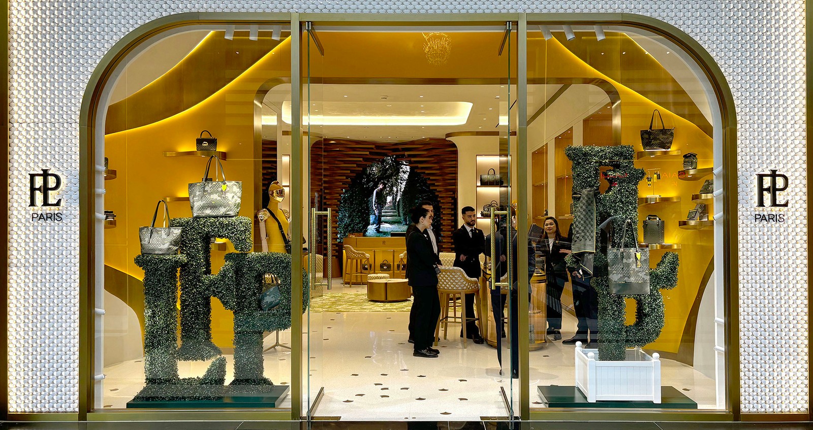 Dès la façade, le motif emblématique des écailles de Fauré Le Page s'affirme avec une présence sculpturale, subtilement rehaussée par un éclairage latéral. De loin, la lumière dessine la forme d'une grande écaille en relief, tandis que de près, la mosaïque complexe de plus petites écailles émerge progressivement, offrant une interprétation dynamique du motif signature de la marque.