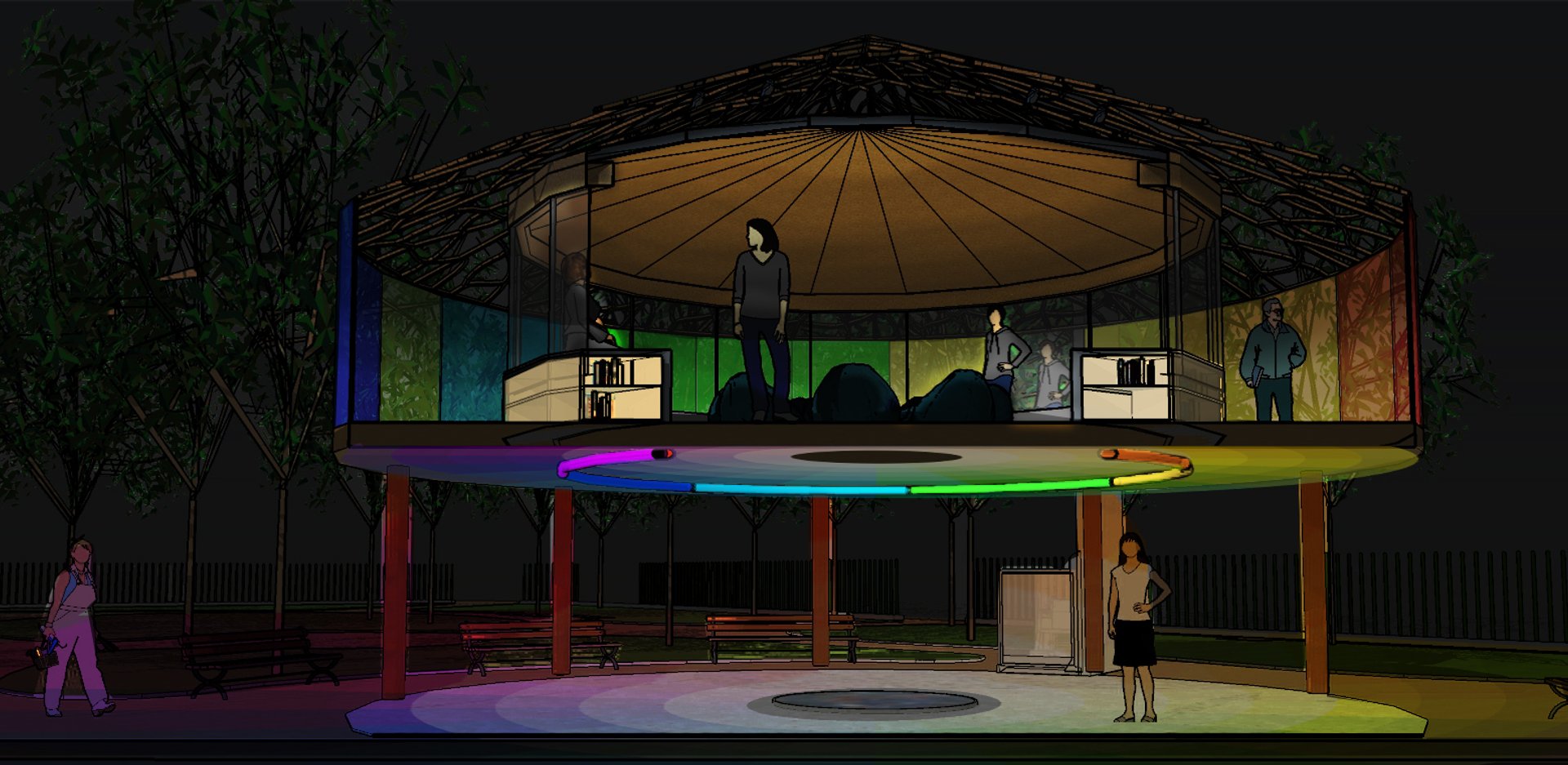 Sous le kiosque, un plénum ouvert accueille une installation immersive de lumière et de son. Un large disque néon diffuse un dégradé lumineux aux teintes arc-en-ciel, créant des atmosphères visuelles changeantes. Les sons, captés en temps réel, sont amplifiés et projetés dans l’espace, interagissant avec le bassin situé au centre du dispositif. Chaque vibration engendre des ondulations uniques à la surface de l’eau, traduisant le son en mouvement et en lumière.