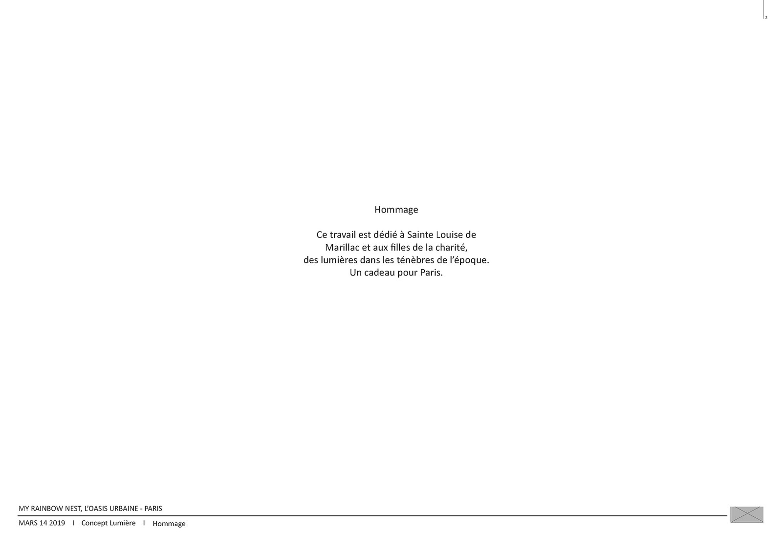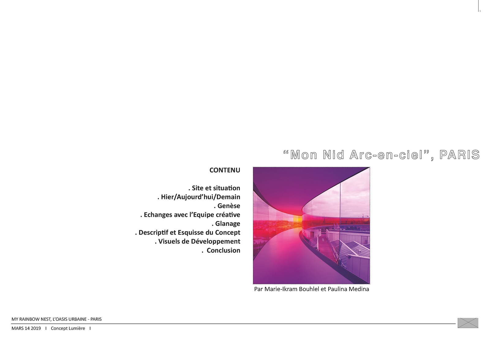 Mon Nid Arc En Ciel est une architecture de lumière conçue et développée de A à Z par Marie-Ikram Bouhlel, fondatrice et directrice de Atelier dada, avec la collaboration de Paulina Medina Carillo, alors stagiaire au sein du studio parisien. Cette initiative personnelle a été pensée comme un cadeau à la ville de Paris, inspirée par l’image du nid : un espace protecteur, suspendu, inscrit dans le tissu urbain.