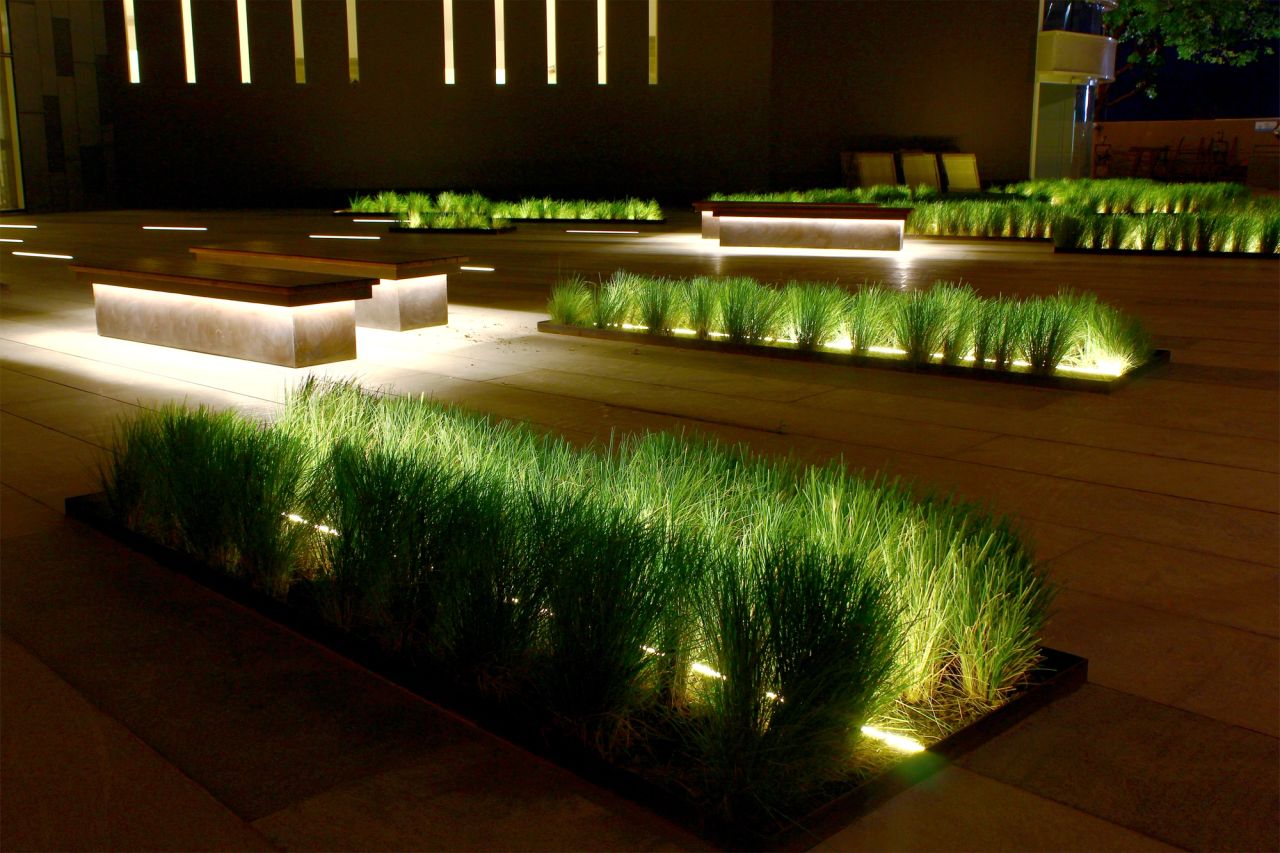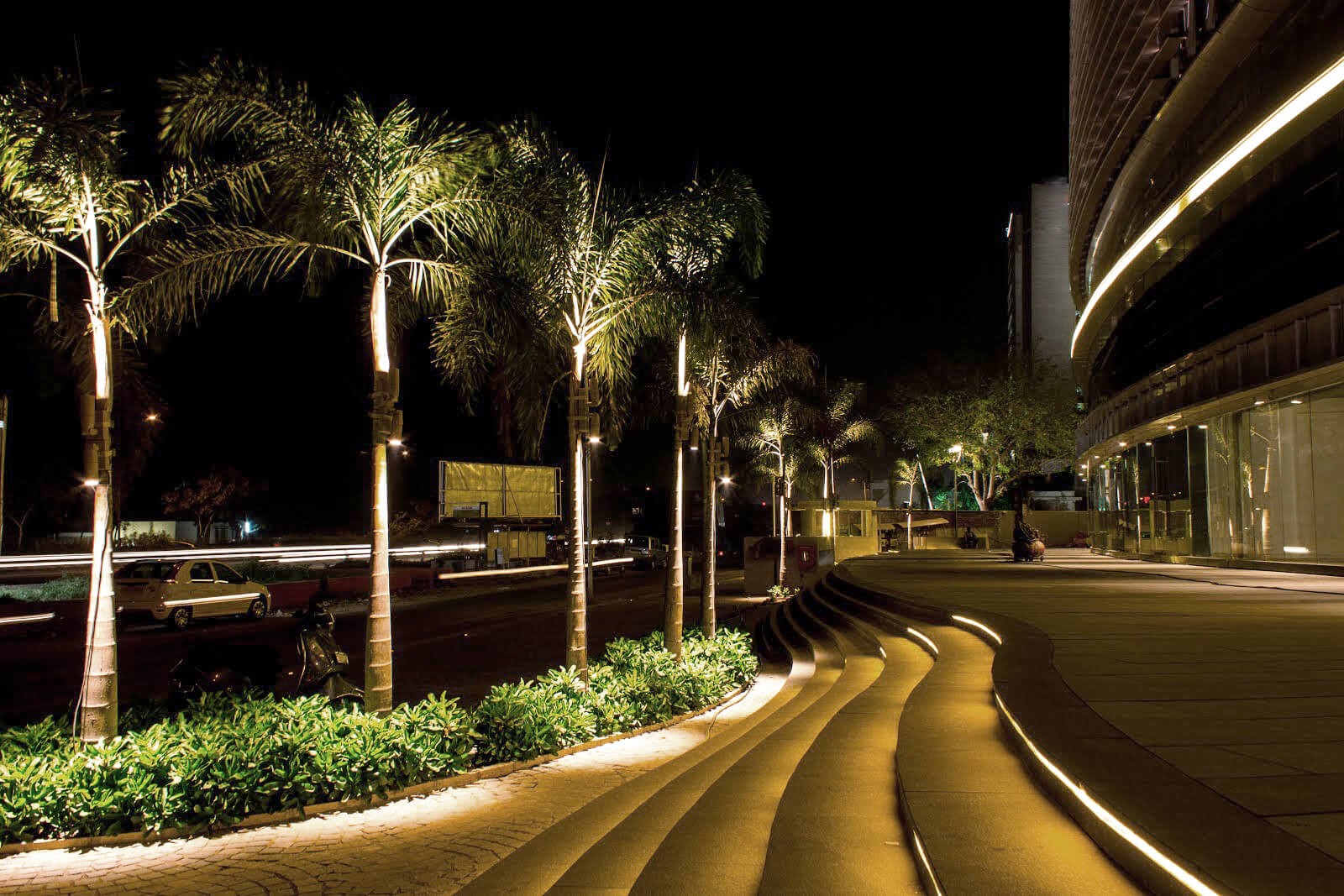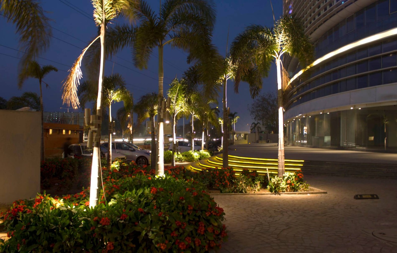 Le langage de la lumière linéaire traverse tout le paysage de Mondeal Square , de manière transparente et parfaitement intégrée. Les interventions lumineuses s’imbriquent dans les détails de l’architecture et du mobilier urbain, devenant une extension naturelle des éléments qu’elles révèlent. Un fil lumineux enveloppe l’ensemble du bâtiment, créant une continuité subtile entre les parties commerciales et les bureaux. Des lignes continues intégrées dans le mobilier soulignent les grandes marches menant aux commerces en rez-de-chaussée, les bancs des espaces de détente, les bacs de plantes et le sol guidant les usagers vers l’entrée des bureaux. Pour renforcer l’interaction entre le paysage et l’architecture, l’ Atelier dada a proposé d’utiliser les palmiers comme supports d’ éclairage . Placés stratégiquement à l’entrée des commerces et visibles depuis l’autoroute, ces palmiers lumineux jouent un rôle clé. Symbole fort de l’identité locale, ces arbres rappellent le passé prospère du 16? siècle, lorsque la ville était recouverte de cette essence végétale. Éclairés côté commerces, ils forment une barrière visuelle focalisant l’œil sur le paysage immédiat et adoucissant la vue sur l’autoroute pour les usagers situés au niveau des tours. Côté autoroute, ils se transforment en silhouettes majestueuses, se découpant en ombres chinoises devant les bâtiments éclairés, offrant une signature visuelle forte et mémorable pour le complexe. À l’arrière des tours, les candélabres prescrits initialement par le client ont été remplacés par des modèles plus performants. Ces nouveaux candélabres, soigneusement sélectionnés pour leur efficacité photométrique , leur faible impact énergétique , et leur respect du ciel nocturne , jalonnent la voie secondaire menant à l’entrée des bureaux et à l’accès au parking souterrain. En réduisant le nombre de points lumineux, tout en augmentant leur qualité et leur esthétique , ils contribuent à renforcer l’ identité globale du complexe tout en répondant aux exigences fonctionnelles. À Mondeal Square, la lumière transcende les limites du simple éclairage pour devenir une alliée de l’architecture et du paysage, transformant l’espace en une continuité vivante et harmonieuse.