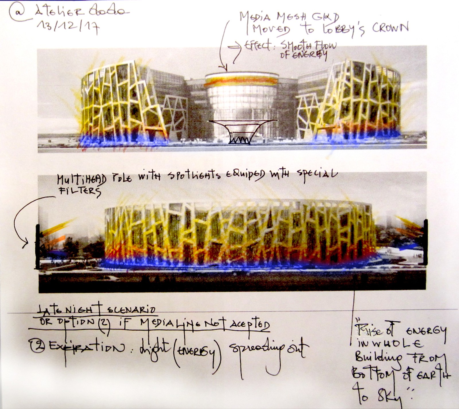 Le projet du siège ONGC est parvenu à Atelier dada après près de neuf années de développement architectural. Implanté à proximité immédiate d’un important pôle commercial, le concept initial de façade visait à évoquer le drapeau indien à travers des barres LED linéaires associées à une maille métallique scintillante. L’équipe d’architectes a alors sollicité Atelier dada afin d’apporter une cohérence d’ensemble par le contenu média et la conception lumière, les équipements présélectionnés présentant des limites techniques et expressives.