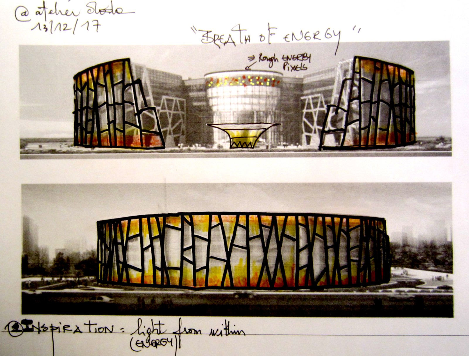 En travaillant exclusivement avec les matériaux déjà acquis, Atelier dada a développé une écriture lumineuse fondée sur le sens plutôt que sur l’effet. Inspiré par la stratification de la croûte terrestre, le concept final raconte l’extraction de l’énergie à travers un jeu de lumière mesuré et mystérieux, où l’architecture et le symbole se rejoignent pour offrir une présence nocturne puissante, sobre et signifiante.
