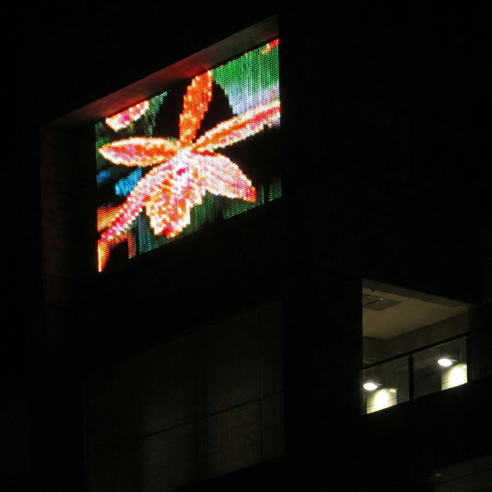 Le projet articulait plusieurs distances de perception. Deux mascottes lumineuses en forme d’orchidées, réalisées à partir de media LED battens, étaient fixées sur les pignons aveugles des blocs latéraux. Visibles de loin, elles agissaient comme des repères lumineux dans le paysage urbain. À une échelle intermédiaire, chaque bloc était équipé d’un écran LED à très basse résolution, positionné au-dessus de son entrée principale. Détournant la typologie classique de la façade média, ces écrans diffusaient des cycles lumineux lents, synchronisés avec l’ensemble du dispositif. À proximité, les arbres bordant la façade avant étaient éclairés en parfaite harmonie chromatique avec les scènes média, comme si la lumière se déployait naturellement à partir du symbole de l’orchidée.