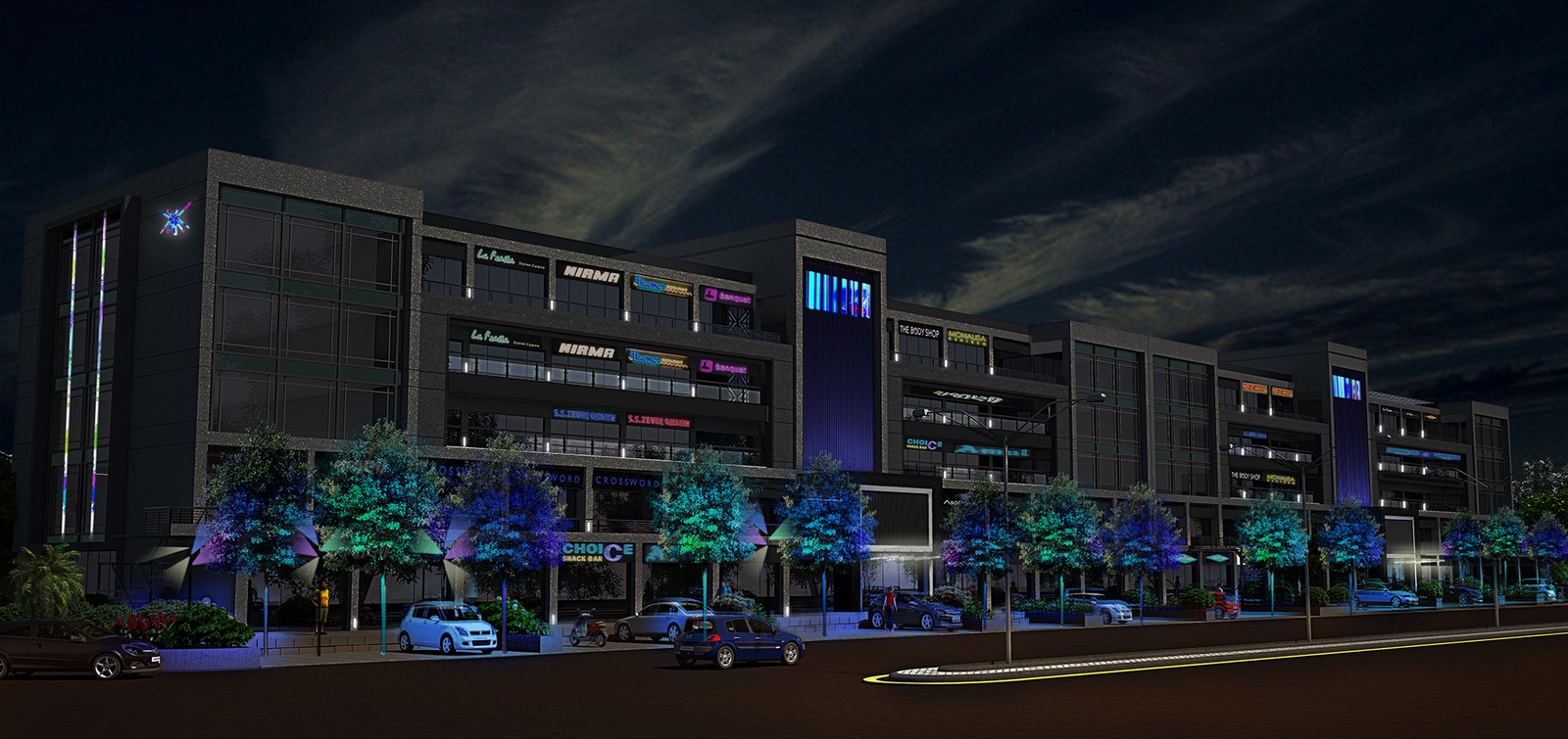 Situé à South Bopal, ORCHID prend place dans un secteur en pleine expansion, encore largement sous-développé au moment de sa conception. Développé par HN Safal, ce centre commercial ne pouvait se contenter d’un éclairage purement fonctionnel. Il devait devenir un repère nocturne, un signal capable d’attirer les habitants des quartiers voisins vers un nouvel espace de vie.