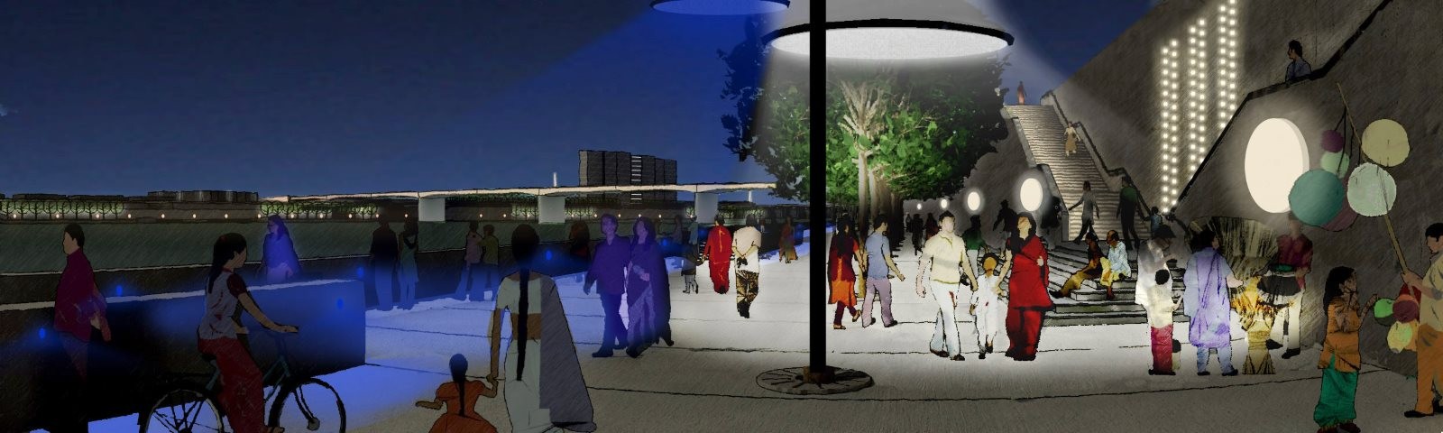 À la demande de l’Ahmedabad Urban Development Authority, Atelier dada a élaboré un plan lumière audacieux et poétique pour les berges de la Sabarmati. L’ambition était de renouveler l’expérience nocturne de la ville tout en faisant écho à la culture locale et à la vie collective. Bien que le projet n’ait pas été réalisé en raison de contraintes budgétaires et calendaires, il a profondément marqué les architectes et les responsables urbains, ouvrant la voie à de futures réflexions.