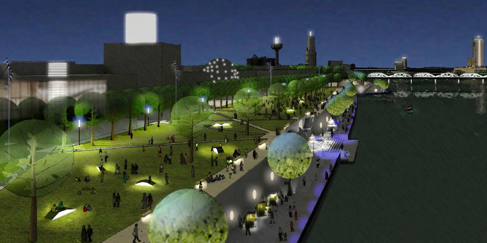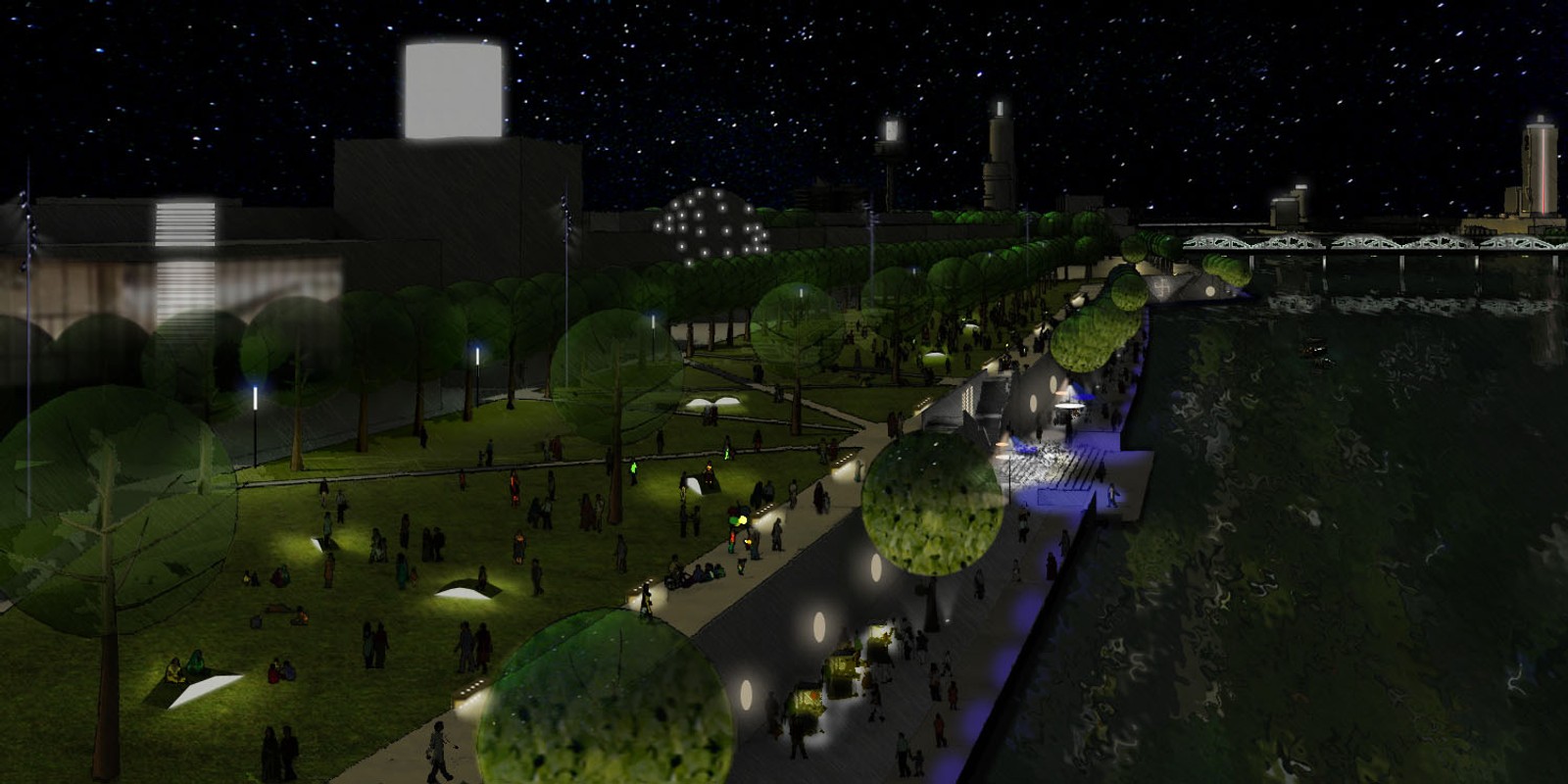 Ce projet dessinait ainsi un front de rivière où l’éclairage architectural devient un médium artistique à part entière. Un espace d’expérimentation et de liberté, où les limites entre infrastructure, art et paysage s’estompent. Bien que non réalisé, ce concept demeure une référence dans l’évolution de la pensée lumière de la ville, porteur d’un imaginaire toujours vivant.