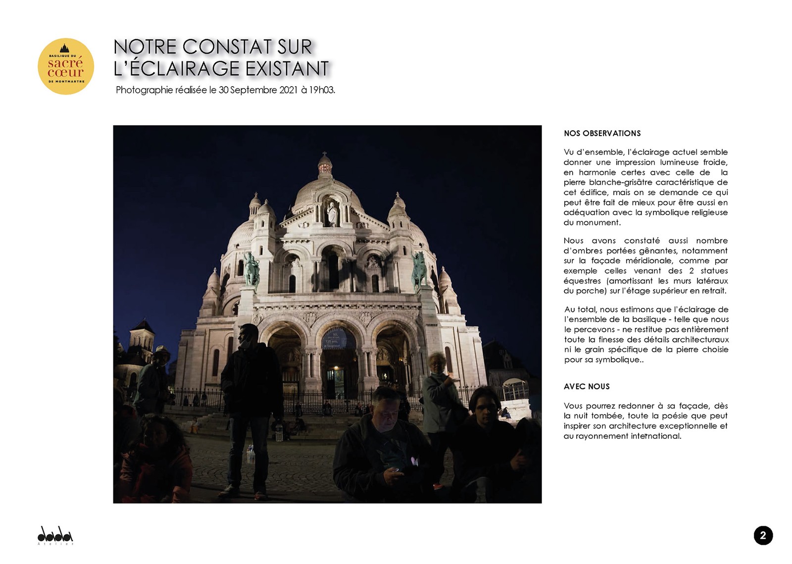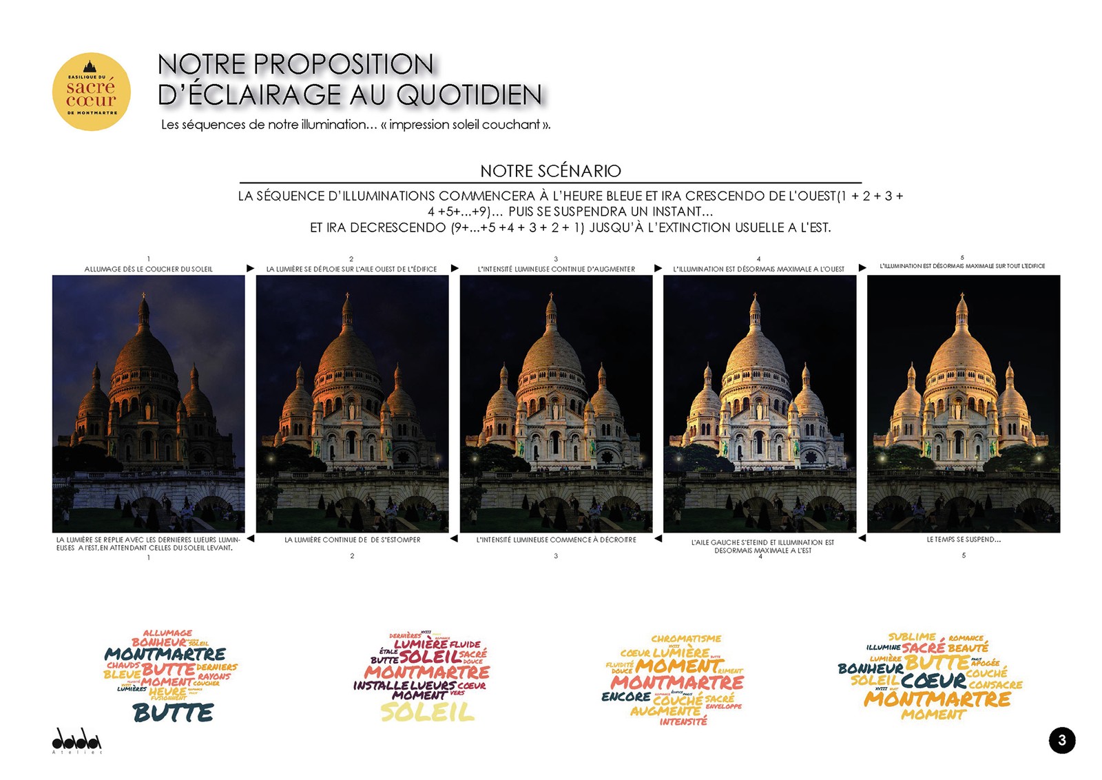 Cette proposition incarne la vision d’Atelier dada pour une présence nocturne renouvelée à Paris, fondée sur l’attention, la retenue et la profondeur. Issue de la réflexion Lavis de lumière, elle aborde la mise en lumière du Sacré-Cœur comme un geste de soin, offrant au monument une manière d’exister la nuit à la fois intime et lointaine.