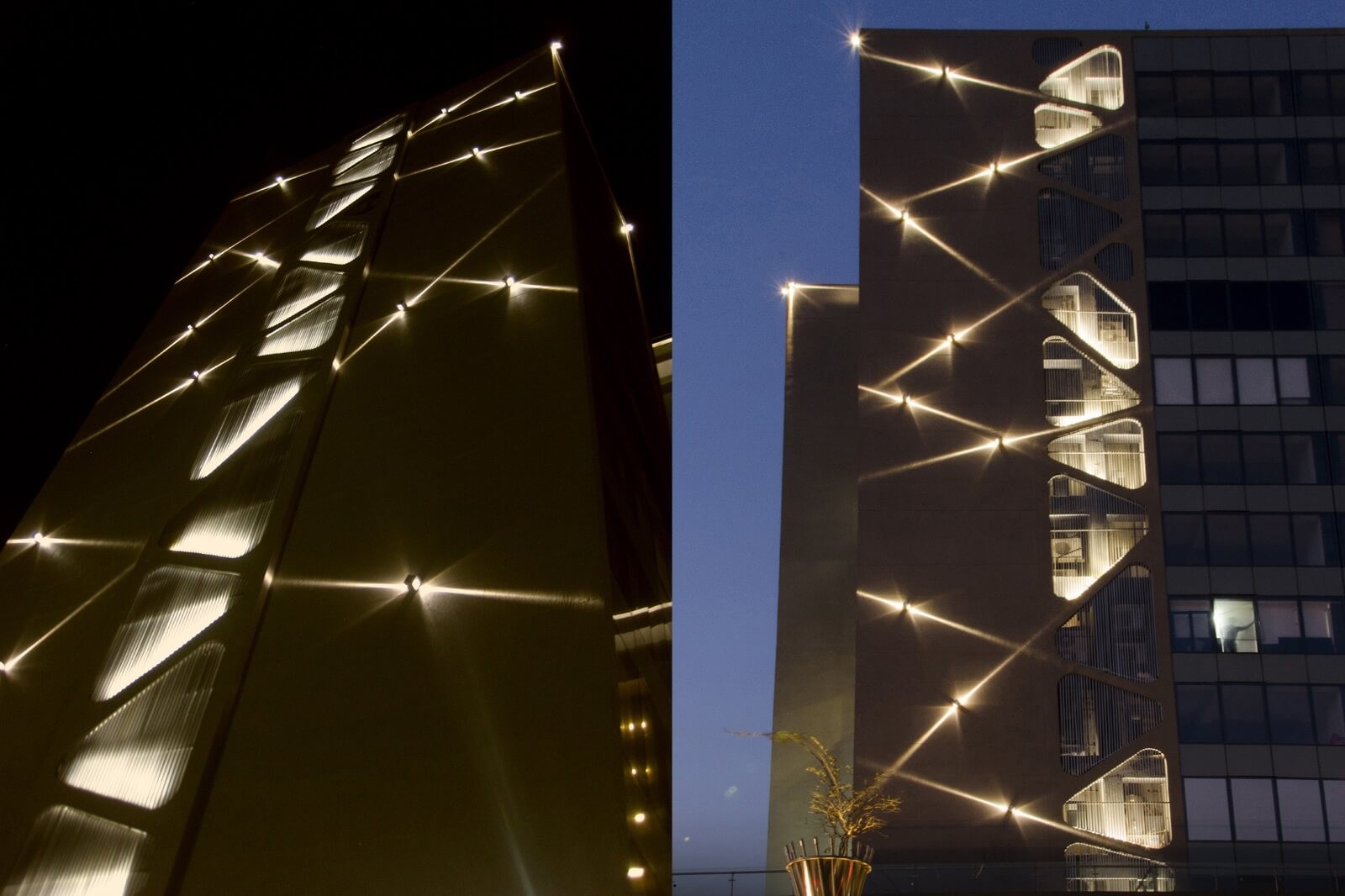 Among several design directions, a poetic abstraction of a solitaire diamond was selected, echoing the tower’s name. This concept unfolds with simplicity and precision. By day, small cubic elements appear randomly scattered across the two blind façades, introducing a subtle visual disturbance and awakening curiosity. By night, these cubes visually dissolve. Light emerges instead through finely aligned beams following the ventilation grids, while additional luminous lines appear as if suspended in space.