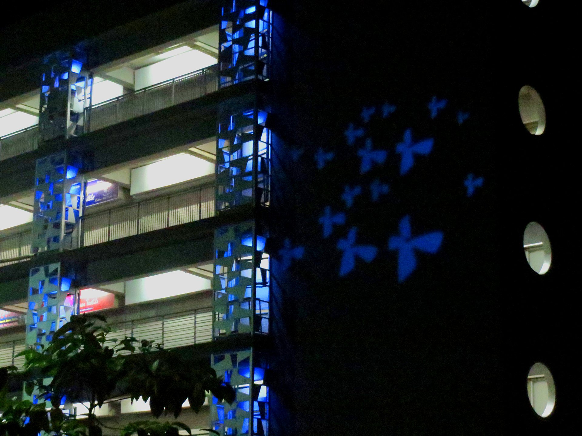 Lorsque la nuit s’installe, ces papillons lumineux s’échappent de leurs cocons, glissent le long des façades et se reflètent doucement sur les cheminements pavés entre les bâtiments. L’espace s’anime alors d’une danse lumineuse enveloppante, à la fois élégante et intrigante.