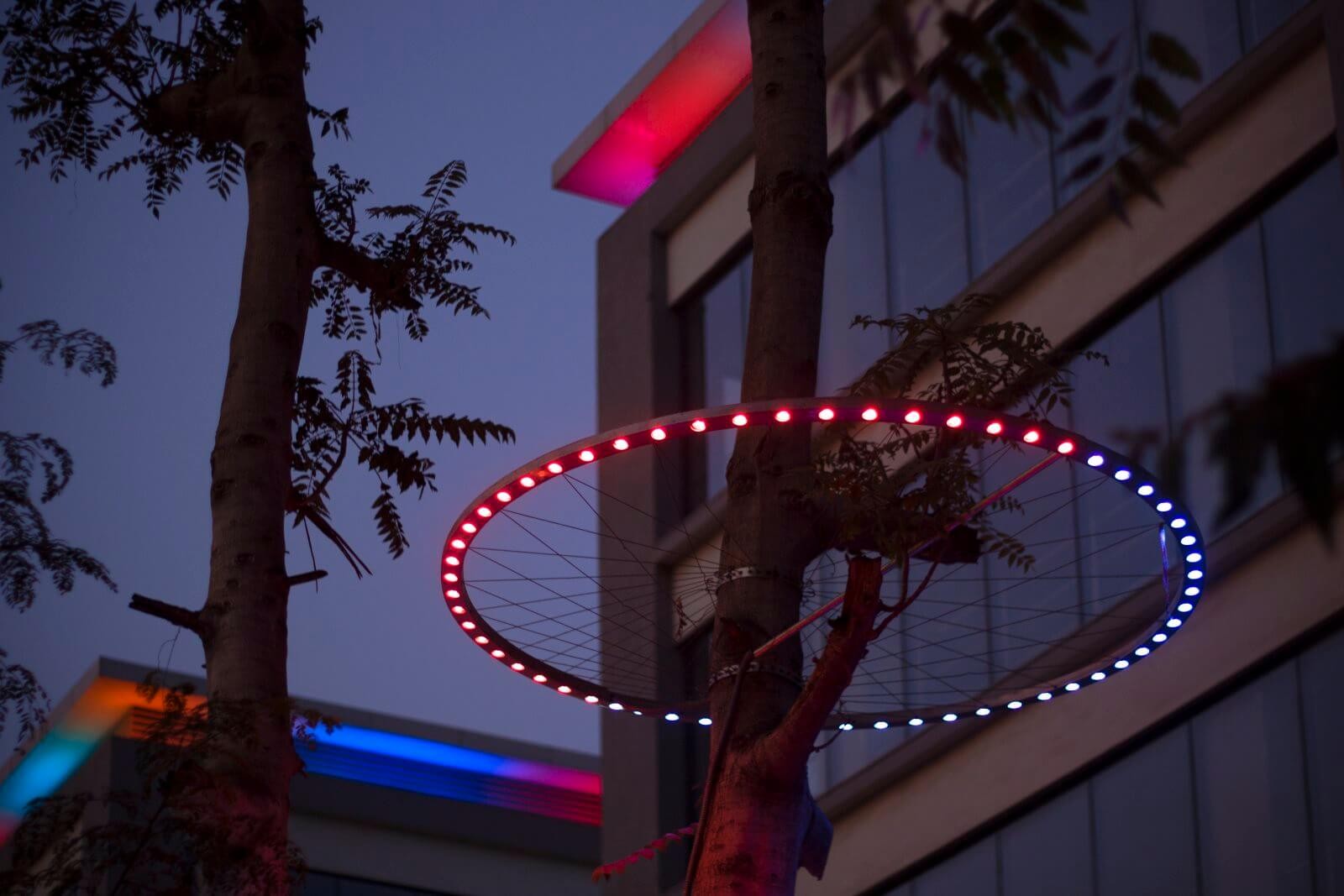 Aura1 est une lumière intégrée aux arbres environnants, inspirée des roues de vélos et de chariots ambulants omniprésents dans le quartier. Ce luminaire rend hommage à l’énergie locale en illuminant avec douceur troncs et branches, créant un lien visuel entre la terre et le ciel. À la tombée de la nuit, Aura1 transforme les arbres en figures lumineuses et bienveillantes, veillant sur le complexe et évoquant la force tranquille des racines profondes, ancrées dans le sol et dans la mémoire du lieu.
