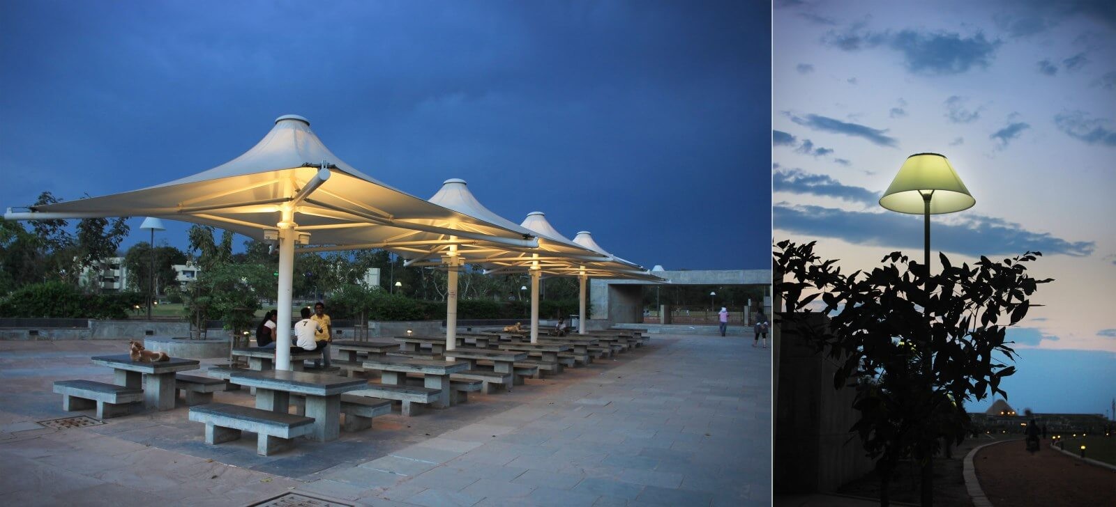 Des pôles piétonniers ponctués d’abat-jour blancs coniques et de grands abat-jours lumineux dans les aires de pique-nique rappellent subtilement la forme du musée Gandhi, le « Mont de Sel ». Cette référence rend hommage à la célèbre marche du sel menée par Gandhi, symbole fondateur de l’indépendance indienne. Elle instaure un rythme calme et signifiant, structurant des espaces intimes, joyeux et communicatifs au cœur du parc.