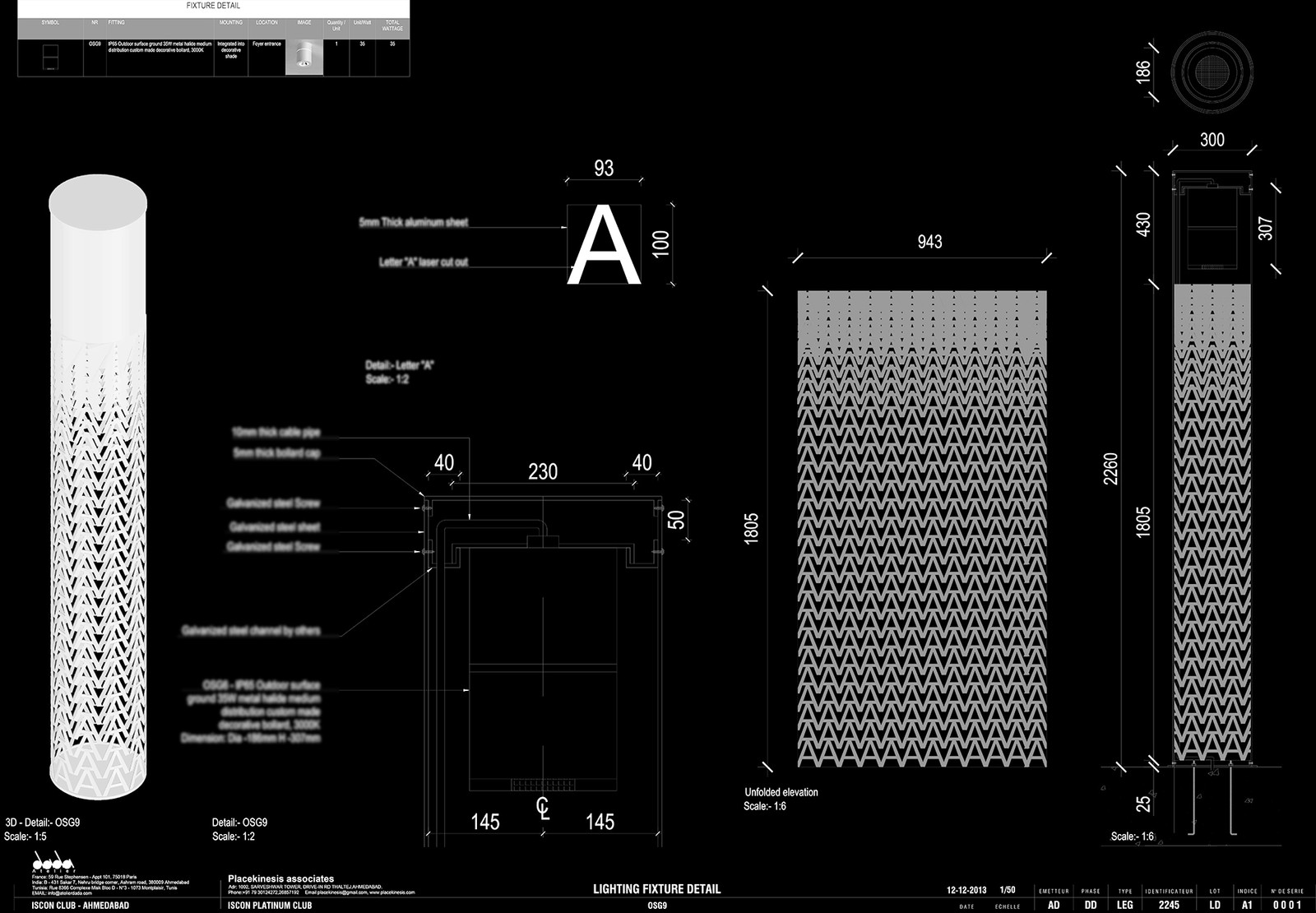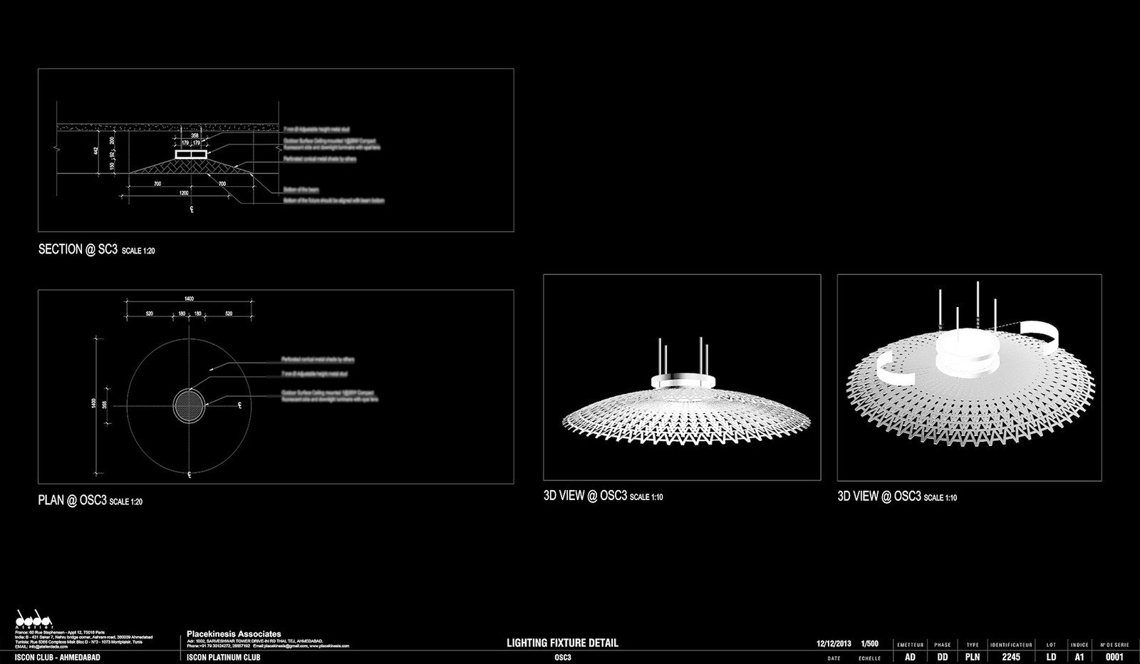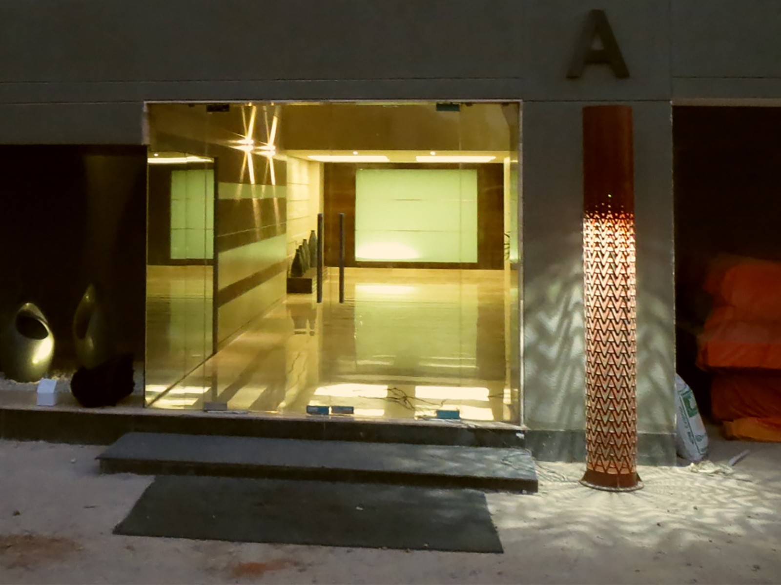 Le dispositif comprenait sept totems lumineux, marquant les accès aux sept blocs du complexe résidentiel Iscon Platinum (A, B, C, D, E, F, G), ainsi que sept modèles de suspensions assorties, conçues pour valoriser les volumes des vides sous bâtiment. L’ensemble formait un système cohérent de repérage et de mise en valeur, conciliant lisibilité, élégance et usage résidentiel.