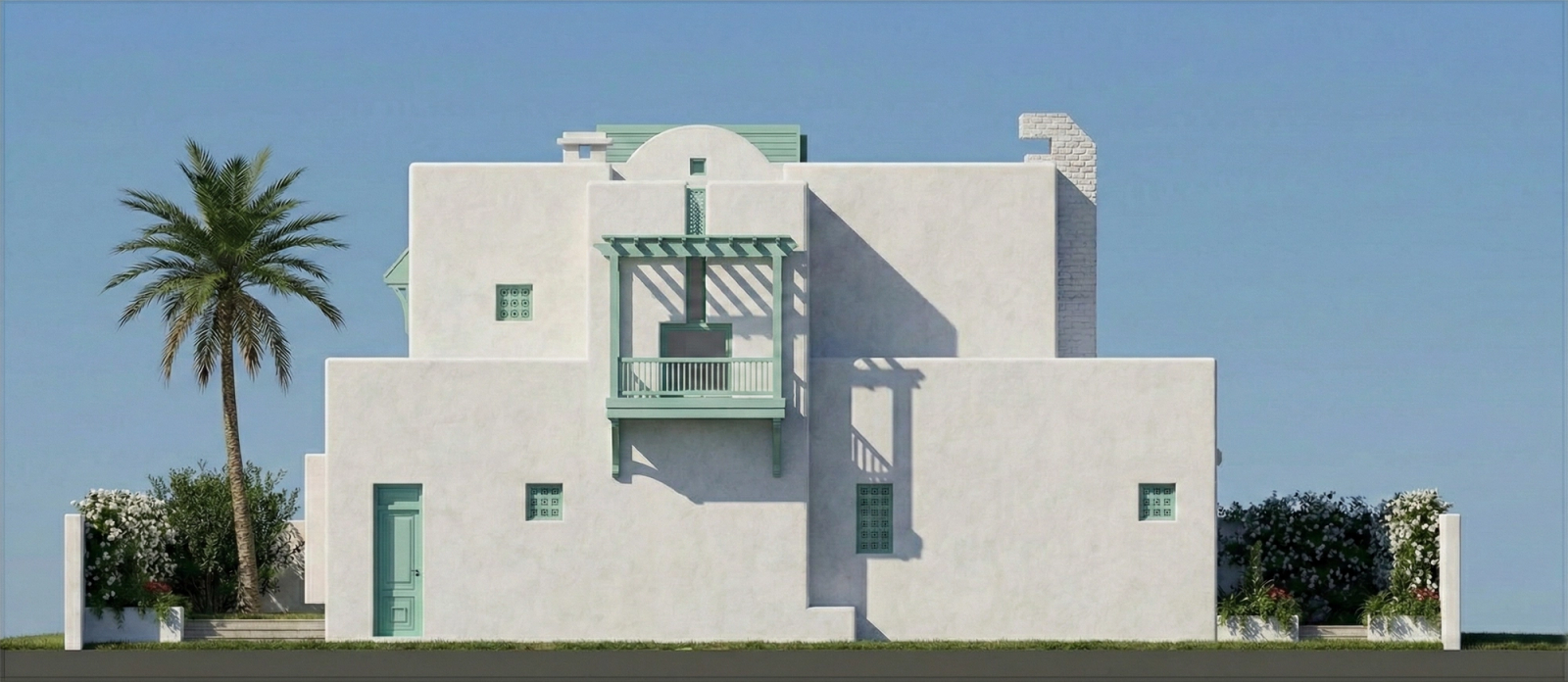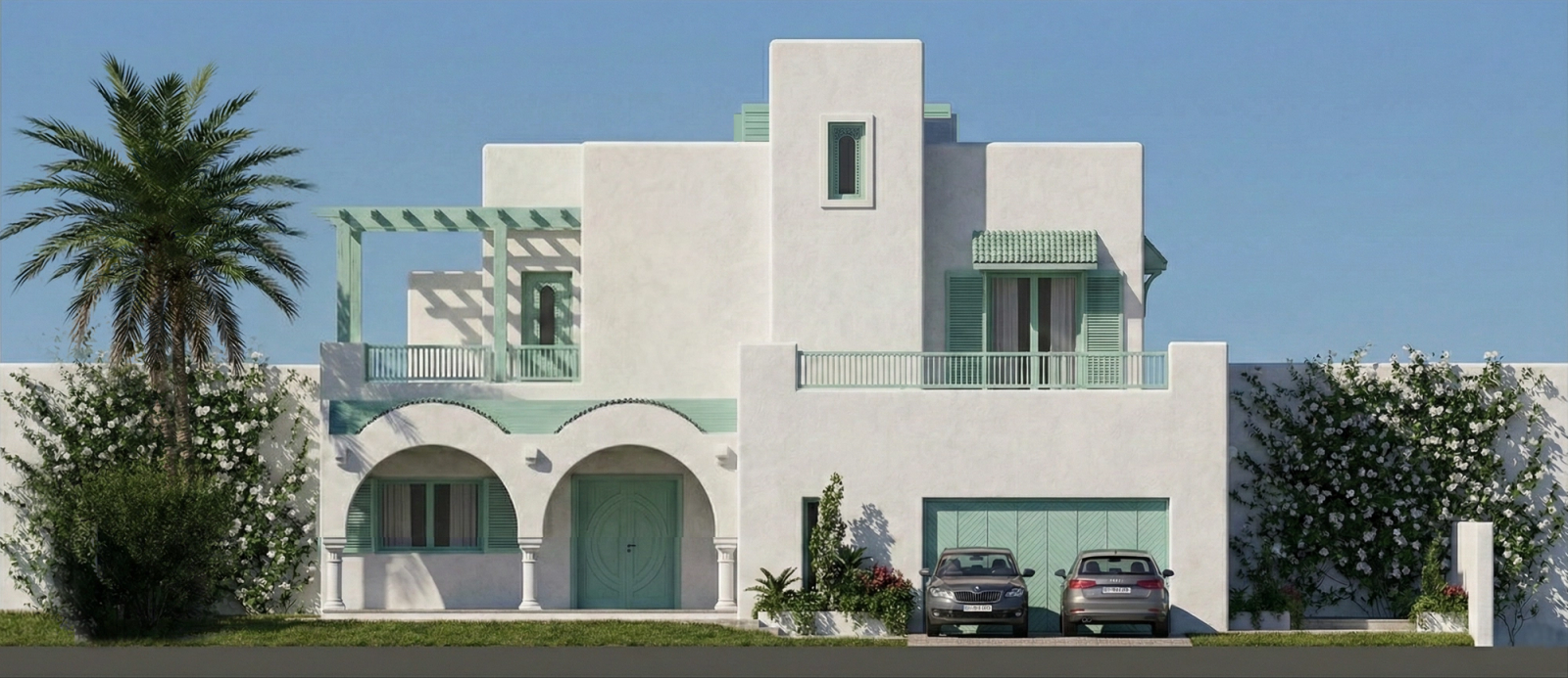 Lors de cette phase, l’architecture s’oriente vers une expression plus explicitement ancrée dans le registre de l’architecture tunisienne classique. Les volumes initiaux, auparavant plus abstraits et épurés, se voient enrichis d’éléments formels issus du vocabulaire local : arcs, portiques, corniches, encadrements marqués et compositions plus symétriques.