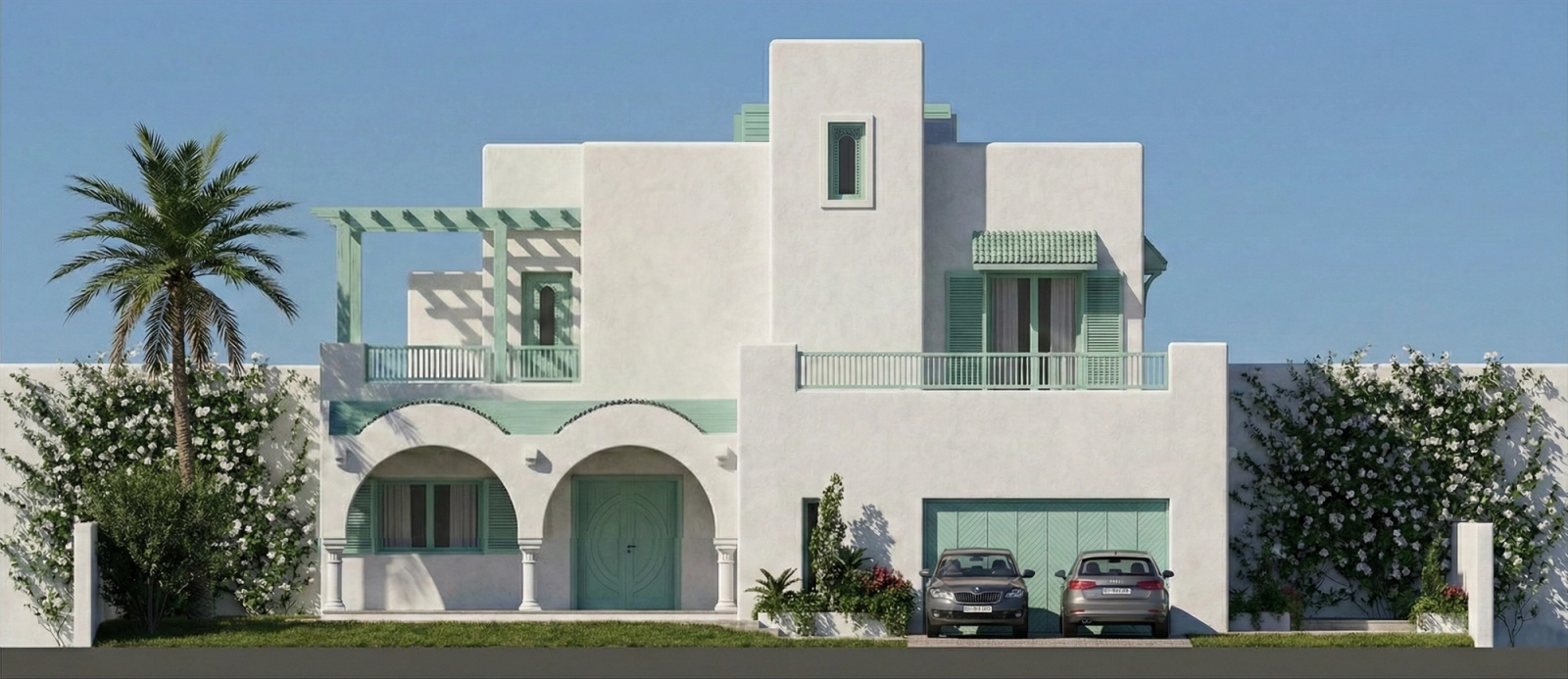 Lors de cette phase, l’architecture s’oriente vers une expression plus explicitement ancrée dans le registre de l’architecture tunisienne classique. Les volumes initiaux, auparavant plus abstraits et épurés, se voient enrichis d’éléments formels issus du vocabulaire local : arcs, portiques, corniches, encadrements marqués et compositions plus symétriques.