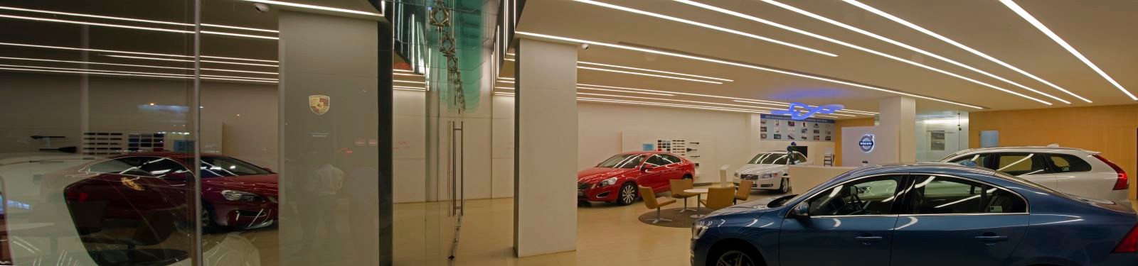 À l’intérieur, ces lignes lumineuses instaurent un rythme calme et fonctionnel. Les éléments encastrés dissimulent avec discrétion les réseaux techniques, préservant la pureté visuelle de l’espace. Réfléchies dans la façade vitrée, les lignes se démultiplient et créent une illusion de profondeur, tandis que leur réfraction sur les surfaces polies des voitures apporte une vibration subtile et vivante. Ce jeu de lumière confère au showroom une identité visuelle singulière, perceptible même à distance.
