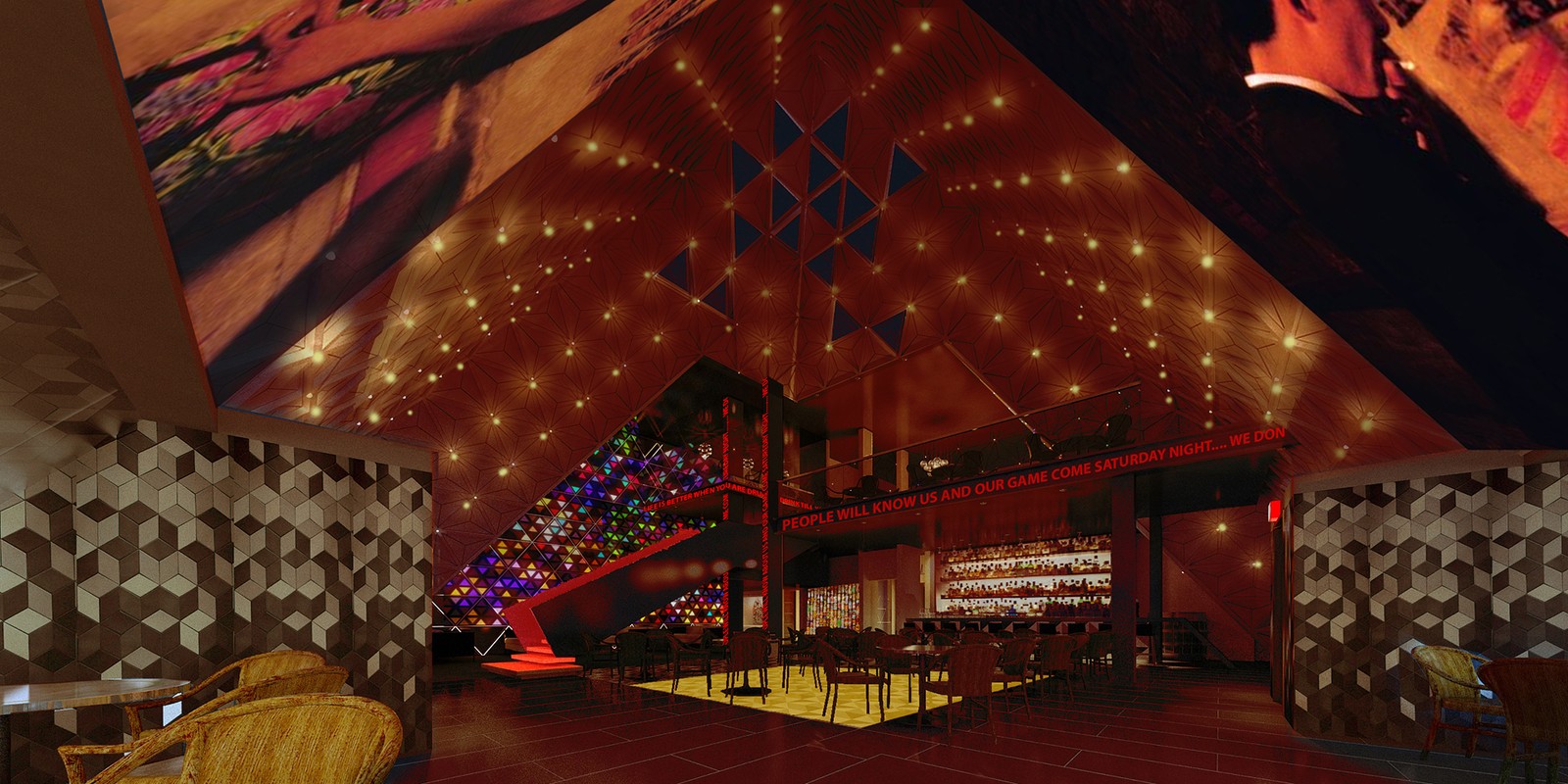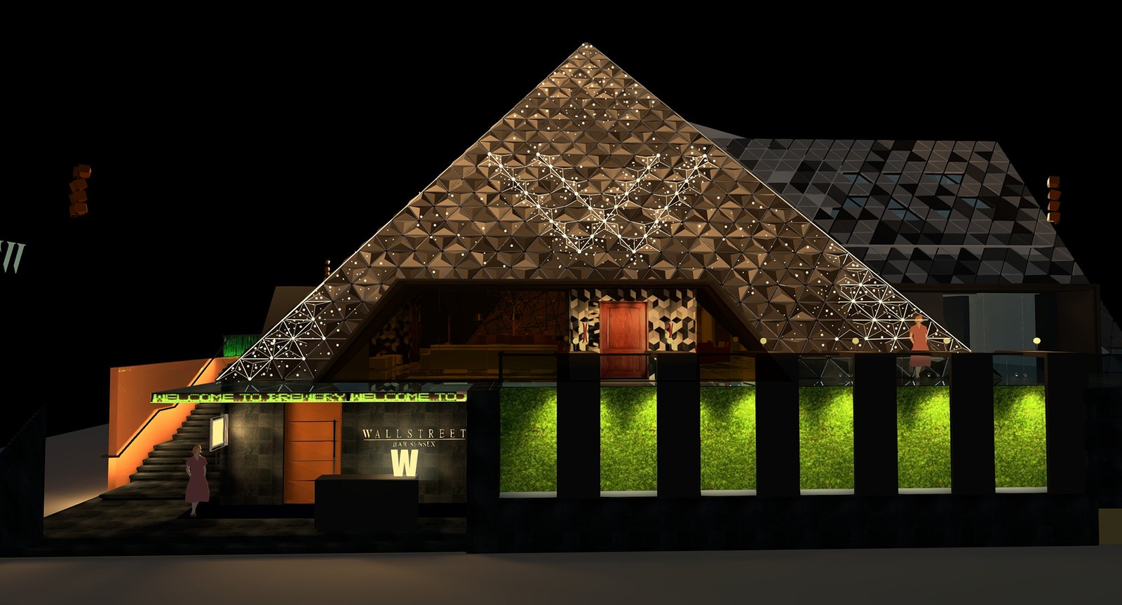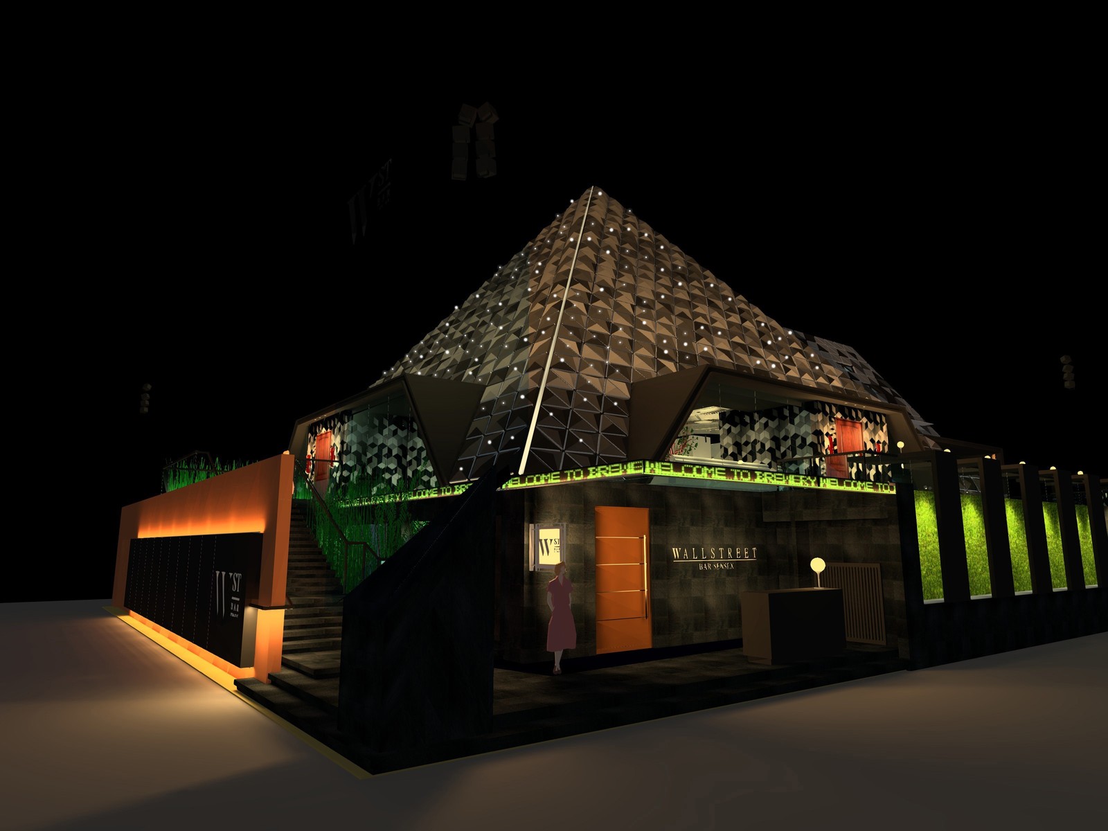 La façade métallique à géométrie pyramidale devient le support d’un effet de constellation scintillante. Des points LED discrets, intégrés au sommet de chaque extrusion triangulaire, composent un motif inspiré du logo de la brasserie. La nuit, cette trame lumineuse évoque un ciel étoilé, captant le regard des passants et conférant au bâtiment une identité nocturne à la fois iconique et vibrante.